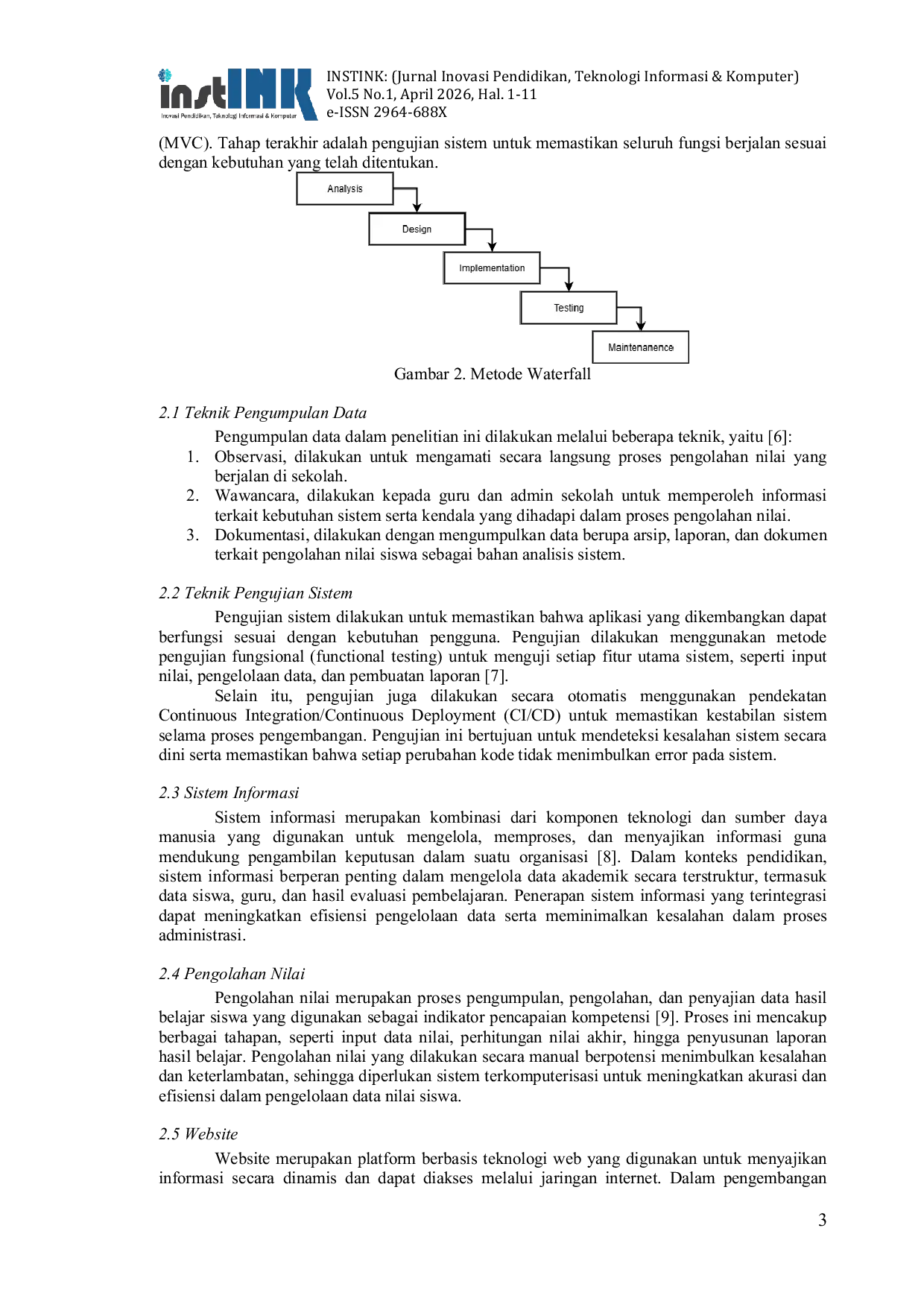Instink: Inovasi Pendidikan, Teknologi Informasi dan KomputerInstink: Inovasi Pendidikan, Teknologi Informasi dan KomputerPenelitian ini bertujuan untuk mengembangkan sistem informasi pengolahan nilai berbasis web guna meningkatkan efisiensi dan akurasi pengelolaan data akademik di MA NU Yosowinangun. Permasalahan utama yang dihadapi adalah proses pengolahan nilai yang masih dilakukan secara manual, sehingga berpotensi menimbulkan keterlambatan dan kesalahan dalam pelaporan hasil belajar siswa. Metode yang digunakan dalam penelitian ini adalah model Waterfall yang meliputi tahapan analisis kebutuhan, perancangan sistem, implementasi, dan pengujian. Sistem dikembangkan menggunakan framework Laravel dengan arsitektur Model-View-Controller (MVC) untuk mendukung pengelolaan data yang terstruktur dan aman. Hasil penelitian menunjukkan bahwa sistem yang dikembangkan mampu mengotomatisasi proses input, pengolahan, dan pelaporan nilai siswa secara terintegrasi. Pengujian sistem dilakukan melalui pengujian fungsional dan otomatisasi berbasis CI/CD yang menunjukkan bahwa seluruh fitur utama berjalan sesuai dengan kebutuhan sistem. Dengan demikian, sistem informasi yang dikembangkan dapat meningkatkan efektivitas pengelolaan nilai serta mendukung digitalisasi administrasi akademik di lingkungan sekolah.