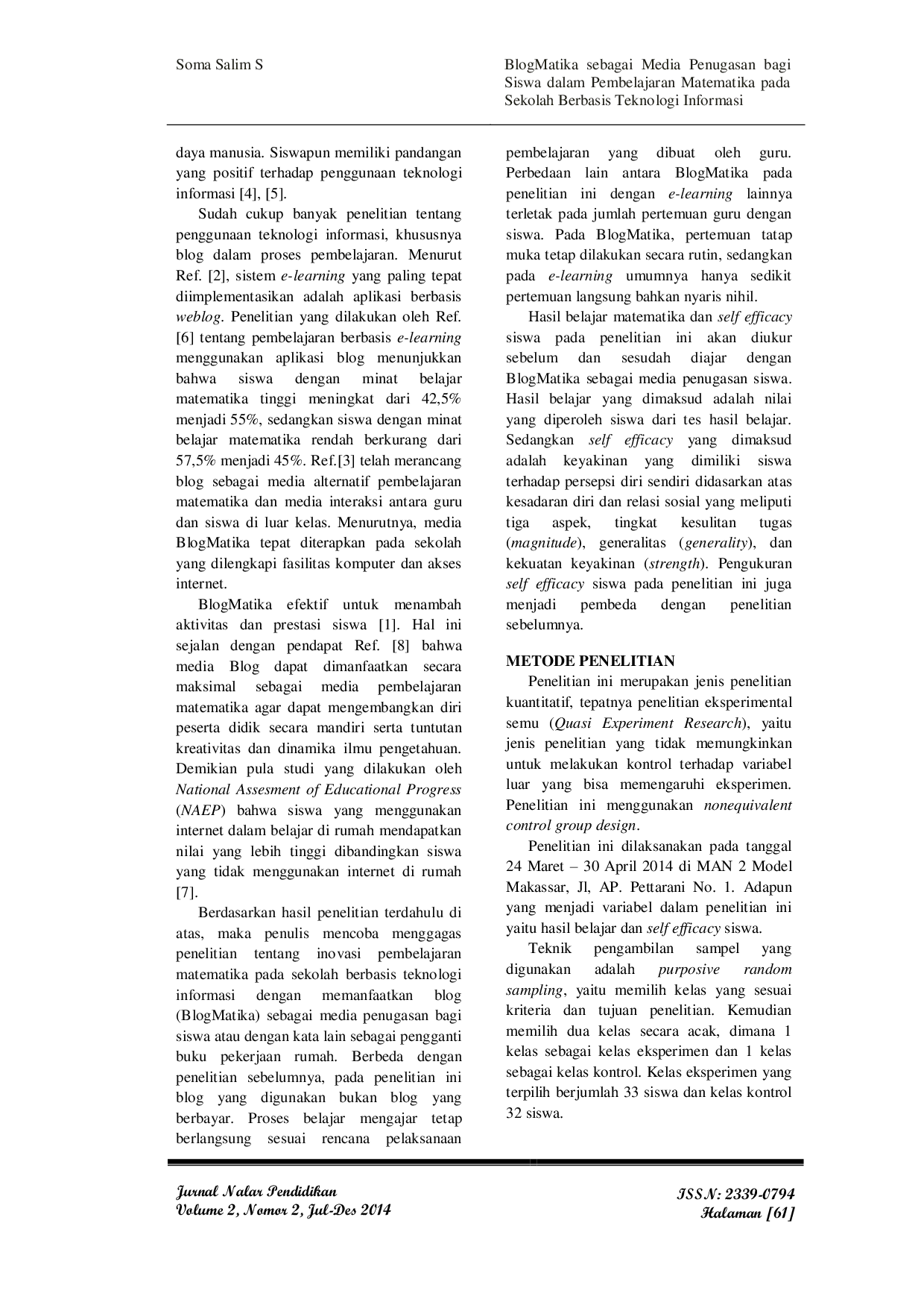 JURNAL NALAR PENDIDIKANJURNAL NALAR PENDIDIKANTujuan penelitian ini adalah membandingkan hasil belajar matematika dan self efficacy siswa antara kelas yang diajar menggunakan BlogMatika dengan kelas yang diajar tidak menggunakan BlogMatika sebagai media penugasan bagi siswa. Penelitian ini merupakan eksperimental semu dan menggunakan nonequivalent control group design. Data dikumpulkan menggunakan tes hasil belajar dan skala self efficacy. Hasil analisis deskriptif menunjukkan bahwa hasil belajar matematika siswa sebelum diajar berada pada kategori sangat rendah dan setelah diajar berada pada kategori cukup, baik pada kelas yang diajar menggunakan BlogMatika (kelas eksperimen) maupun pada kelas yang tidak diajar menggunakan BlogMatika (kelas kontrol). Hasil analisis inferensial (uji t) menunjukkan terdapat perbedaan hasil belajar matematika dan self efficacy siswa sebelum dan sesudah diajar, baik pada kelas eksperimen maupun pada kelas kontrol. Namun, kelas yang diajar menggunakan BlogMatika lebih baik dalam meningkatkan hasil belajar matematika dan self efficacy siswa dibandingkan kelas yang diajar tanpa menggunakan BlogMatika sebagai media penugasan bagi siswa.