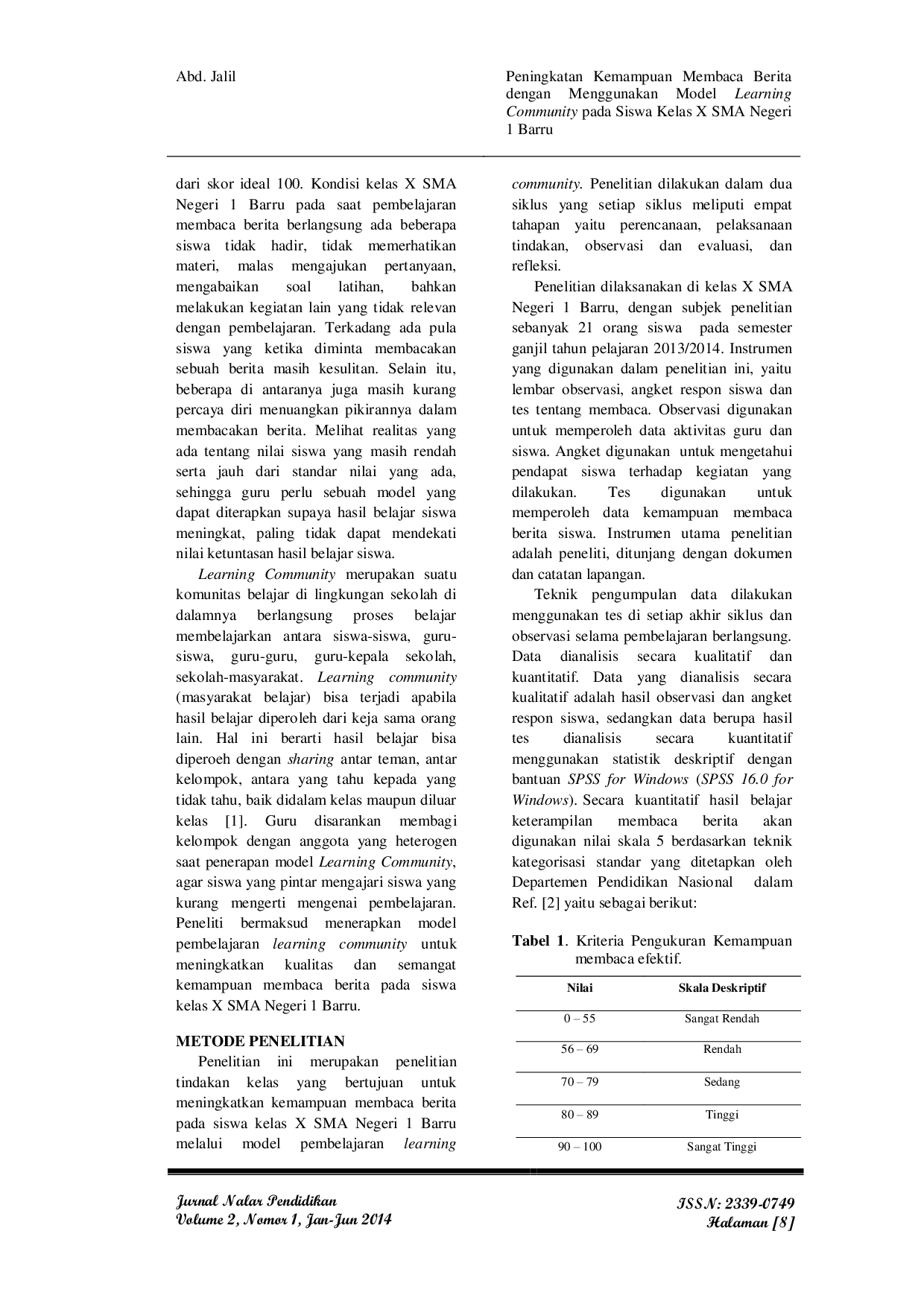 JURNAL NALAR PENDIDIKANJURNAL NALAR PENDIDIKANPenelitian ini bertujuan untuk meningkatkan kemampuan membaca berita pada siswa kelas X SMA Negeri 1 Barru melalui penerapan model learning community. Subjek penelitian adalah 21 siswa kelas X SMA Negeri 1 Barru semester ganjil tahun pelajaran 2013/2014. Hasil yang dicapai adalah: a) Meningkatnya hasil keterampilan membaca berita pada siswa, dilihat dari meningkatnya skor rata-rata hasil belajar membaca, pada siklus I nilai rata-rata 73,6 dari skor ideal 100, skor maksimum 80, skor minimum 50 berada pada kategori rendah. Meningkat pada siklus II nilai rata-rata menjadi 85,9, skor maksimum 95. Siswa tuntas belajar pada siklus I 71,4% dan meningkat pada siklus II menjadi 100%. b) Terjadinya peningkatan keaktifan siswa dalam proses belajar mengajar sesuai dengan hasil observasi yang dilakukan selama penelitian. Kehadiran siswa pada siklus I 100% tetap pada siklus II menjadi 100%. Siswa yang aktif mengerjakan tugas pada siklus I 42,9% meningkat pada siklus II menjadi 90%.