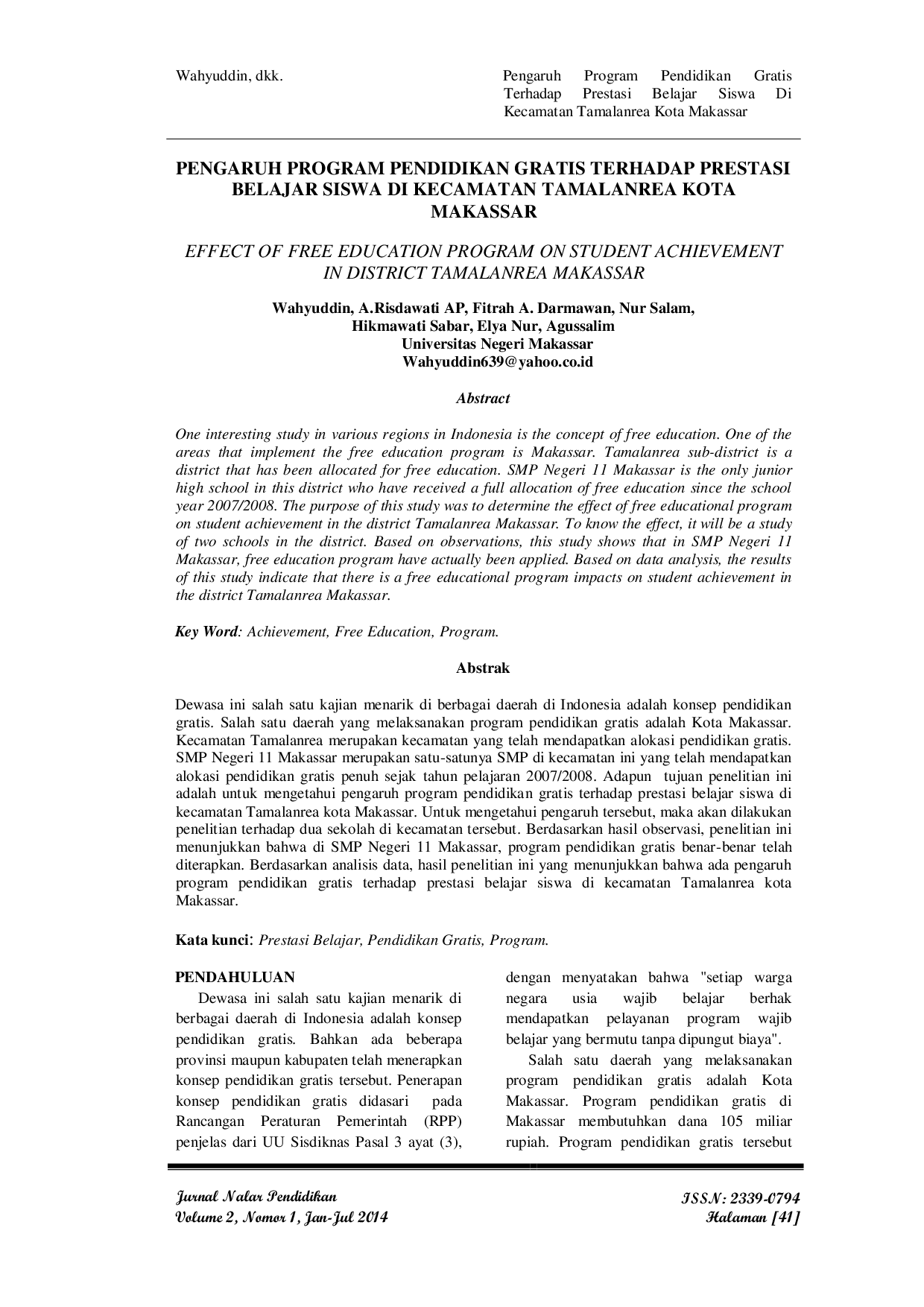 JURNAL NALAR PENDIDIKANJURNAL NALAR PENDIDIKANDewasa ini salah satu kajian menarik di berbagai daerah di Indonesia adalah konsep pendidikan gratis. Salah satu daerah yang melaksanakan program pendidikan gratis adalah Kota Makassar. Kecamatan Tamalanrea merupakan kecamatan yang telah mendapatkan alokasi pendidikan gratis. SMP Negeri 11 Makassar merupakan satu-satunya SMP di kecamatan ini yang telah mendapatkan alokasi pendidikan gratis penuh sejak tahun pelajaran 2007/2008. Adapun tujuan penelitian ini adalah untuk mengetahui . Untuk mengetahui pengaruh tersebut, maka akan dilakukan penelitian terhadap dua sekolah di kecamatan tersebut. Berdasarkan hasil observasi, penelitian ini menunjukkan bahwa di SMP Negeri 11 Makassar, program pendidikan gratis benar-benar telah diterapkan. Berdasarkan analisis data, hasil penelitian ini yang menunjukkan bahwa ada .