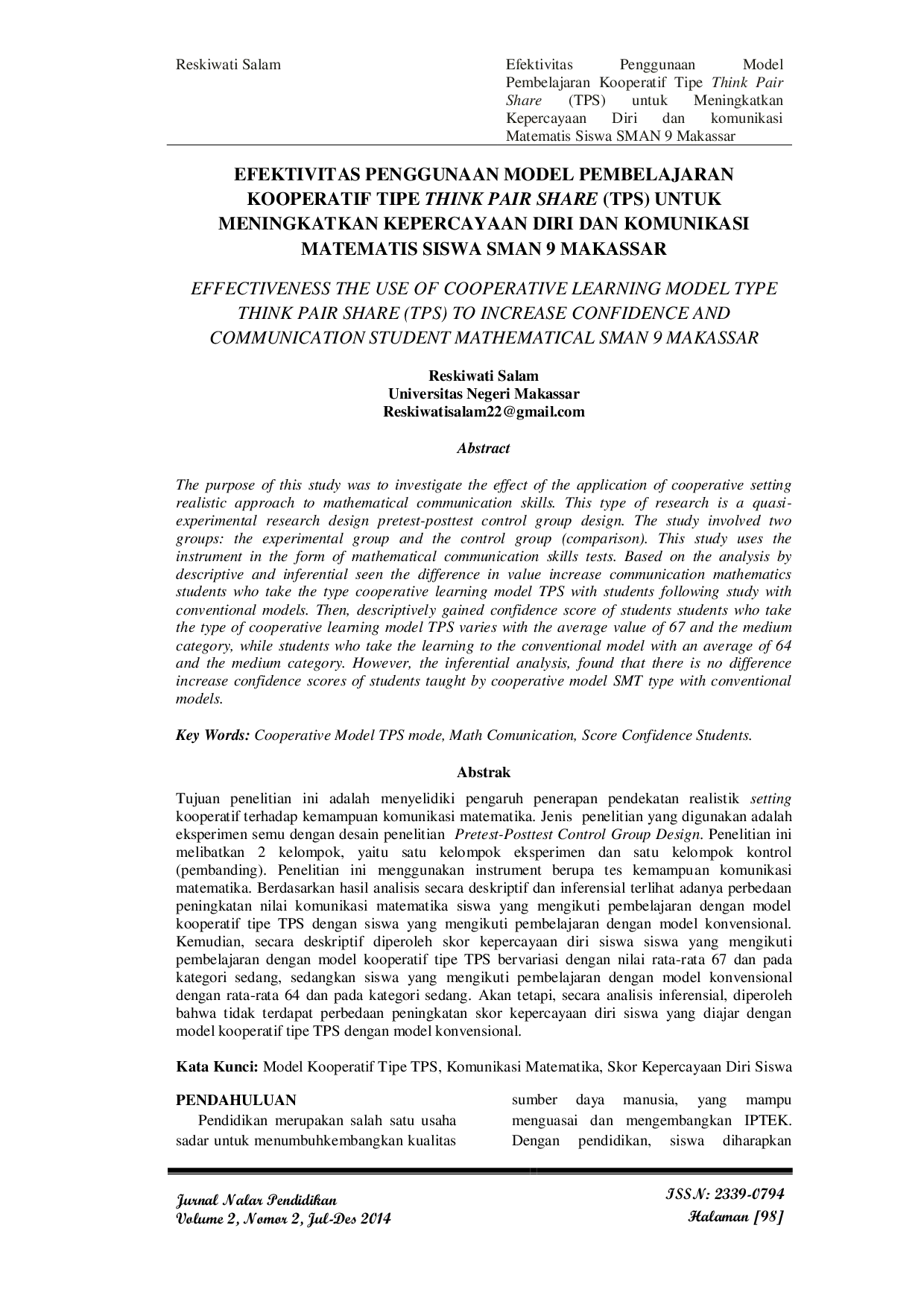 JURNAL NALAR PENDIDIKANJURNAL NALAR PENDIDIKANTujuan penelitian ini adalah menyelidiki pengaruh penerapan pendekatan realistik setting kooperatif terhadap kemampuan komunikasi matematika. Jenis penelitian yang digunakan adalah eksperimen semu dengan desain penelitian Pretest-Posttest Control Group Design. Penelitian ini melibatkan 2 kelompok, yaitu satu kelompok eksperimen dan satu kelompok kontrol (pembanding). Penelitian ini menggunakan instrument berupa tes kemampuan komunikasi matematika. Berdasarkan hasil analisis secara deskriptif dan inferensial terlihat adanya perbedaan peningkatan nilai komunikasi matematika siswa yang mengikuti pembelajaran dengan model kooperatif tipe TPS dengan siswa yang mengikuti pembelajaran dengan model konvensional. Kemudian, secara deskriptif diperoleh skor kepercayaan diri siswa siswa yang mengikuti pembelajaran dengan model kooperatif tipe TPS bervariasi dengan nilai rata-rata 67 dan pada kategori sedang, sedangkan siswa yang mengikuti pembelajaran dengan model konvensional dengan rata-rata 64 dan pada kategori sedang. Akan tetapi, secara analisis inferensial, diperoleh bahwa tidak terdapat perbedaan peningkatan skor kepercayaan diri siswa yang diajar dengan model kooperatif tipe TPS dengan model konvensional.