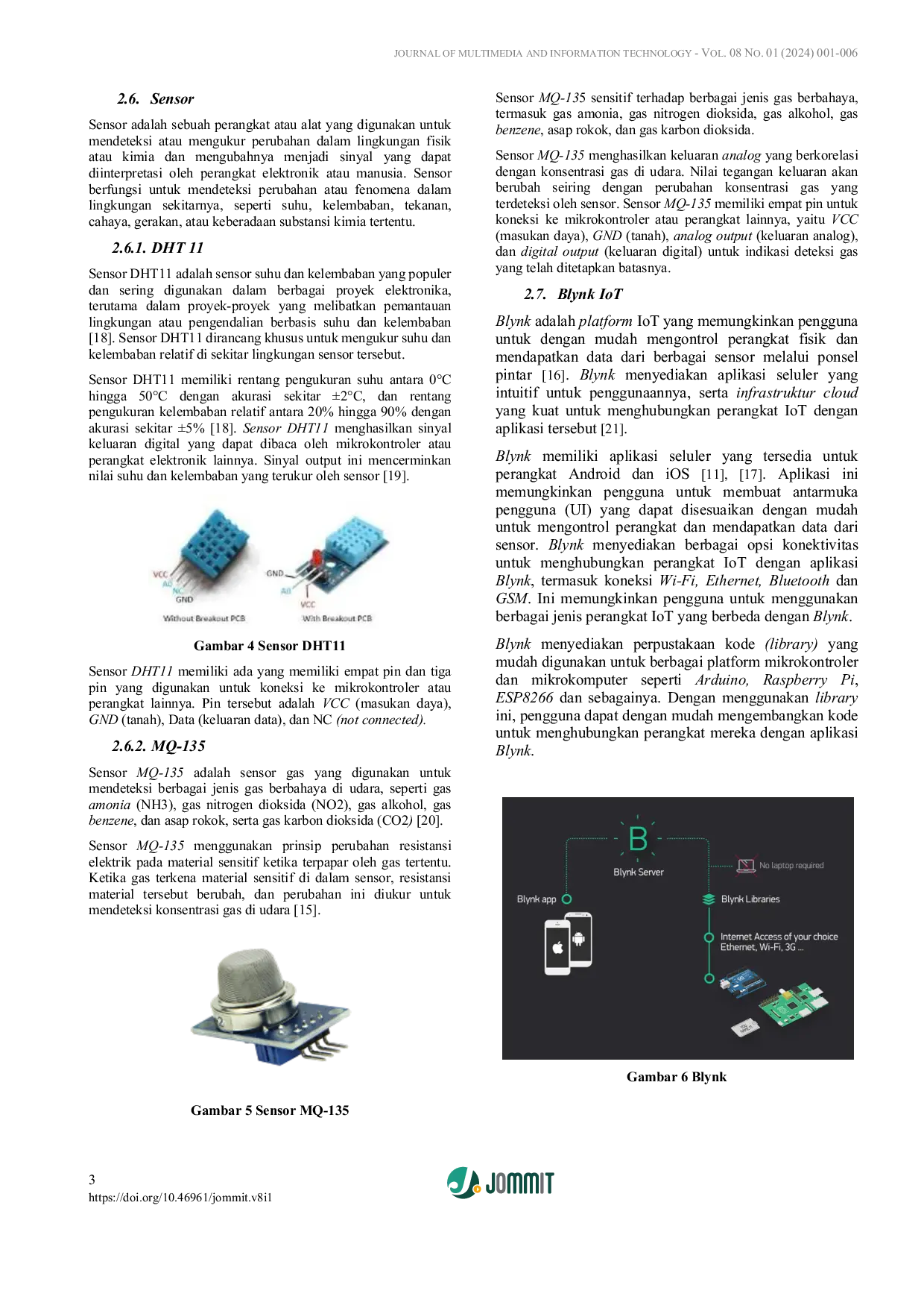 JoMMiT : Jurnal Multi Media dan ITJoMMiT : Jurnal Multi Media dan ITInternet of Things (IoT) adalah teknologi yang memungkinkan benda-benda di sekitar dapat terhubung dengan jaringan internet. Implementasi teknologi IoT diterapkan dalam berbagai bidang, khususnya di bidang peternakan, untuk melakukan monitoring gas, suhu dan kelembaban pada kandang ayam Closed house. Monitoring gas serta suhu dan kelembaban pada kandang ayam Closed house dirasa masih kurang efektif, karena proses monitoring gas, suhu dan kelembaban pada kandang ayam masih dilakukan secara konvensional dan belum memanfaatkan teknologi jaringan internet. Oleh karena itu, perlu dibuat sistem yang dapat memonitoring keadaan gas, suhu dan kelembaban pada kandang ayam Closed house dengan memanfaatkan jaringan internet dengan menggunakan sensor DHT11, Sensor MQ-135 serta module ESP8266 NodeMCU sebagai mikrokontroller yang memproses dan mengirimkan data sehingga hasilnya bisa dilihat di smartphone. Tujuan sistem monitoring telemetri gas, suhu dan kelembaban kandang ayam berbasis IoT untuk membantu meningkatkan kecepatan proses dan akurasi monitoring kandang dalam rangka menjaga pertumbuhan ayam dengan baik.