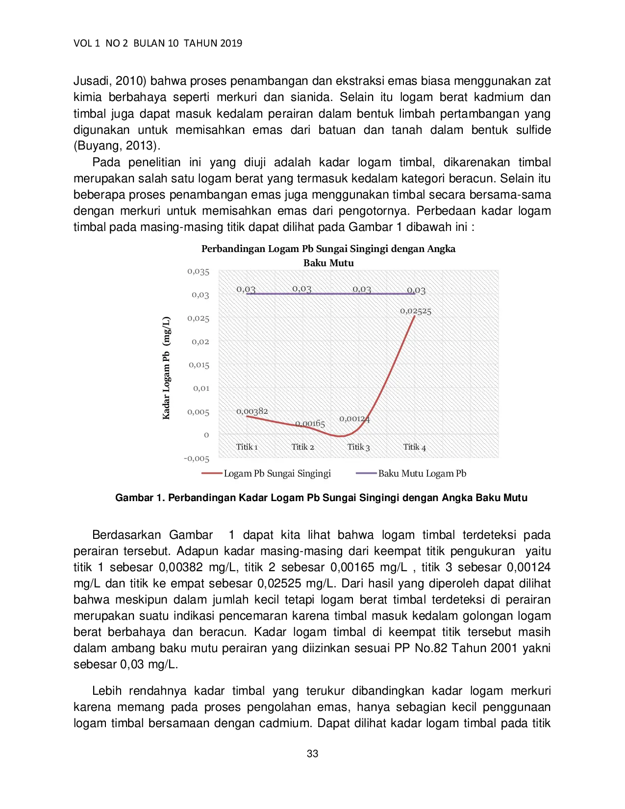 Journal of Research and Education ChemistryJournal of Research and Education ChemistryEkosistem kita telah terkontaminasi oleh logam berat dengan konsentrasi yang tinggi yang dihasilkan oleh berbagai aktivitas manusia seperti kegiatan industri. Penelitian ini menguji kandungan logam berat akibat aktivitas penambangan emas tanpa izin (PETI) di Sungai Singingi, berdasarkan fakta bahwa kondisi sungai terus mengalami penurunan kualitas. Pemilihan penentuan kandungan logam berat Pb atau timbal didasarkan pada pengetahuan bahwa pengolahan emas menggunakan logam merkuri, timbal, dan kadmium untuk mengikat emas dan memisahkannya dari batuan dan tanah dalam bentuk sulfida. Metode penelitian ini menggunakan metode survei dengan penentuan titik sampling secara purposive berdasarkan lokasi maraknya aktivitas PETI. Sampel diukur pada empat titik, dimulai dari titik terdekat dengan aktivitas PETI hingga titik terjauh. Hasil pengujian kadar logam timbal menunjukkan nilai 0,00382 mg/L; 0,00165 mg/L; 0,00124 mg/L dan 0,02525 mg/L. Hasil ini mengindikasikan bahwa sungai tersebut terkontaminasi logam timbal, meskipun masih berada dalam ambang baku mutu yang diizinkan, yaitu 0,03 mg/L.