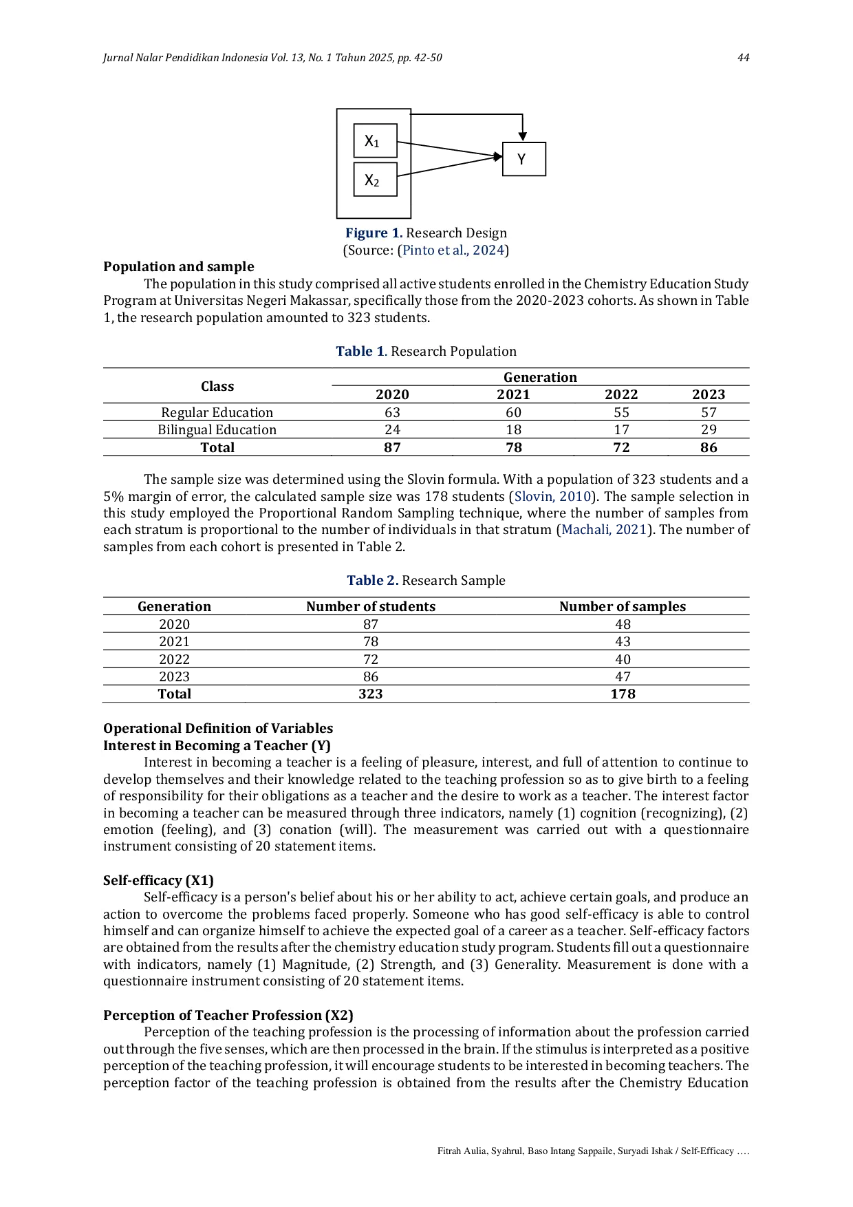 JURNAL NALAR PENDIDIKANJURNAL NALAR PENDIDIKANMinat untuk mengejar karir sebagai guru merupakan faktor penting dalam persiapan calon pendidik masa depan, khususnya dalam program pendidikan guru. Tujuan Penelitian ini yaitu 1) untuk mengetahui pengaruh efikasi diri dan persepsi profesi guru secara terhadap minat menjadi guru pada mahasiswa prodi pendidikan kimia, 2) untuk mengetahui pengaruh efikasi diri terhadap minat menjadi guru mahasiswa prodi pendidikan kimia, 3) untuk mengetahui pengaruh persepsi profesi guru terhadap minat menjadi guru mahasiswa prodi pendidikan kimia. Pendekatan korelasional kuantitatif digunakan, dengan peserta yang dipilih melalui pengambilan sampel acak proporsional. Variabel independen meliputi efikasi diri (X1), yang mewakili kepercayaan diri mahasiswa dalam keterampilan mengajar mereka, dan persepsi profesi guru (X2), yang mencakup sikap terhadap citra profesi, tantangan, dan signifikansi sosial. Variabel dependennya adalah minat mahasiswa untuk mengejar karir sebagai guru (Y). Kuesioner digunakan untuk mengumpulkan data, dan reliabilitasnya dinilai dengan menggunakan Cronbachs Alpha, validitas konstruk dengan korelasi product-moment Pearson, dan konten menggunakan model Gregory. Dampak dari variabel independen terhadap variabel dependen dievaluasi dengan menggunakan analisis regresi. Hasil penelitian menunjukkan bahwa motivasi mahasiswa dalam mengejar karir di bidang pengajaran sangat dipengaruhi oleh pendapat mereka tentang profesi guru dan juga tingkat efikasi diri mereka.