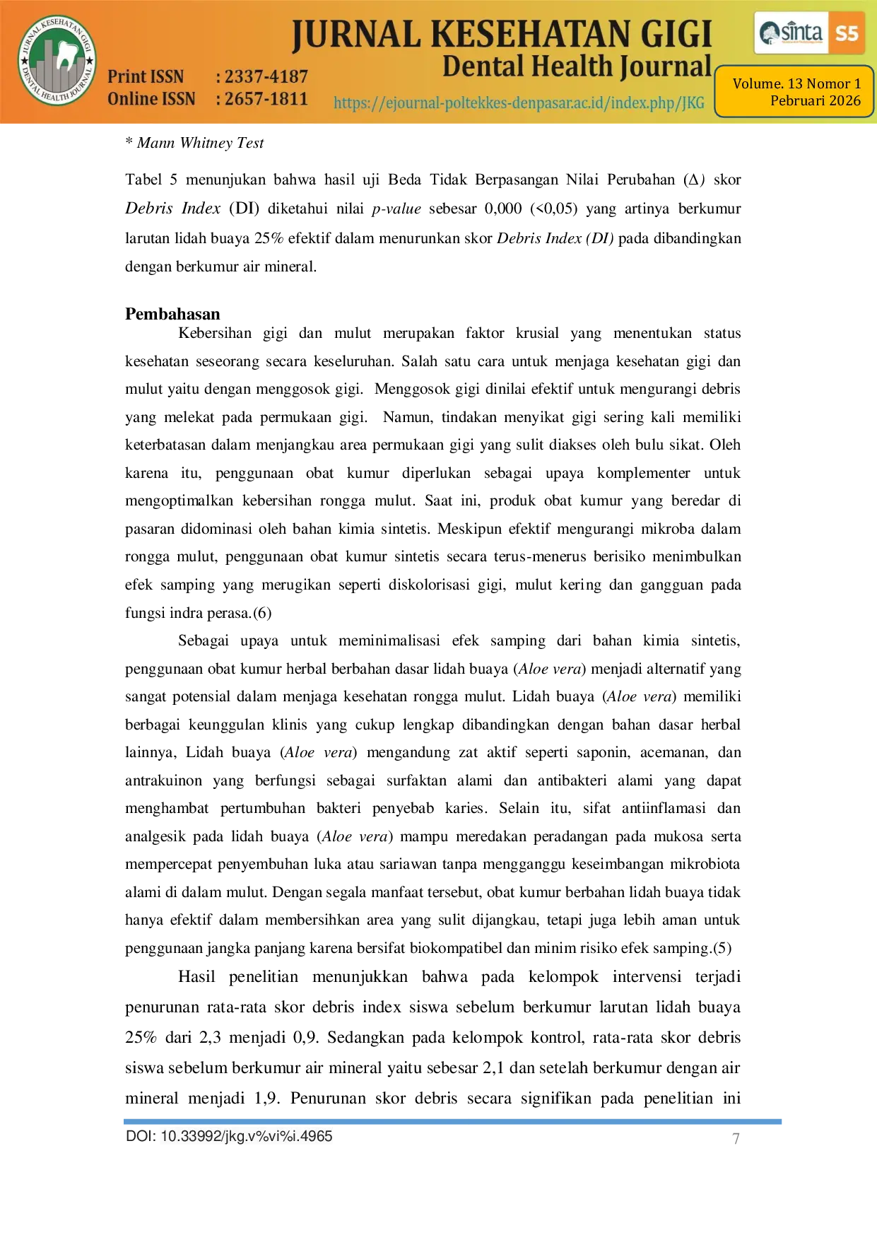 Jurnal Kesehatan Gigi (Dental Health Journal)Jurnal Kesehatan Gigi (Dental Health Journal)Kesehatan gigi dan mulut merupakan faktor penting dalam menentukan kesehatan sistemik secara keseluruhan, namun seringkali diabaikan. Akumulasi debris merupakan faktor etiologi utama dari berbagai masalah kesehatan mulut, termasuk gingivitis dan karies gigi. Meskipun menyikat gigi secara mekanis efektif, terdapat keterbatasan dalam menjangkau area anatomis tertentu, sehingga diperlukan intervensi komplementer seperti obat kumur. Penelitian ini bertujuan untuk menganalisis pengaruh berkumur dengan larutan Aloe vera 25% terhadap perubahan skor Debris Index (DI) pada siswa SMP Mutiara 5 Lembang. Penelitian ini menggunakan metode kuasi-eksperimen dengan rancangan pretest-posttest kontrol kelompok. Sebanyak 44 siswa dipilih secara purposif dan dibagi menjadi dua kelompok: kelompok intervensi menggunakan larutan Aloe vera 25% dan kelompok kontrol menggunakan air mineral. Skor Debris Index (DI) diukur pada enam gigi indeks. Analisis data dilakukan menggunakan uji univariat dan bivariat (uji Wilcoxon dan Mann Whitney). Pada kelompok intervensi, skor Debris Index rata-rata menurun secara signifikan dari 2,3 menjadi 0,9 (p = 0,000). Sebaliknya, kelompok kontrol menunjukkan penurunan yang tidak signifikan dari 2,1 menjadi 1,9 (p = 0,145). Analisis bivariat mengonfirmasi bahwa larutan Aloe vera 25% secara signifikan lebih efektif dalam menurunkan skor debris dibandingkan air mineral (p = 0,000). Kesimpulan: Berkumur dengan larutan Aloe vera 25% efektif dalam mengurangi skor Debris Index (DI). Senyawa aktif alami dalam Aloe vera, seperti saponin, acemannan, dan antrakuinon, bekerja secara sinergis sebagai pembersih alami dan agen antibakteri untuk meningkatkan kebersihan mulut.