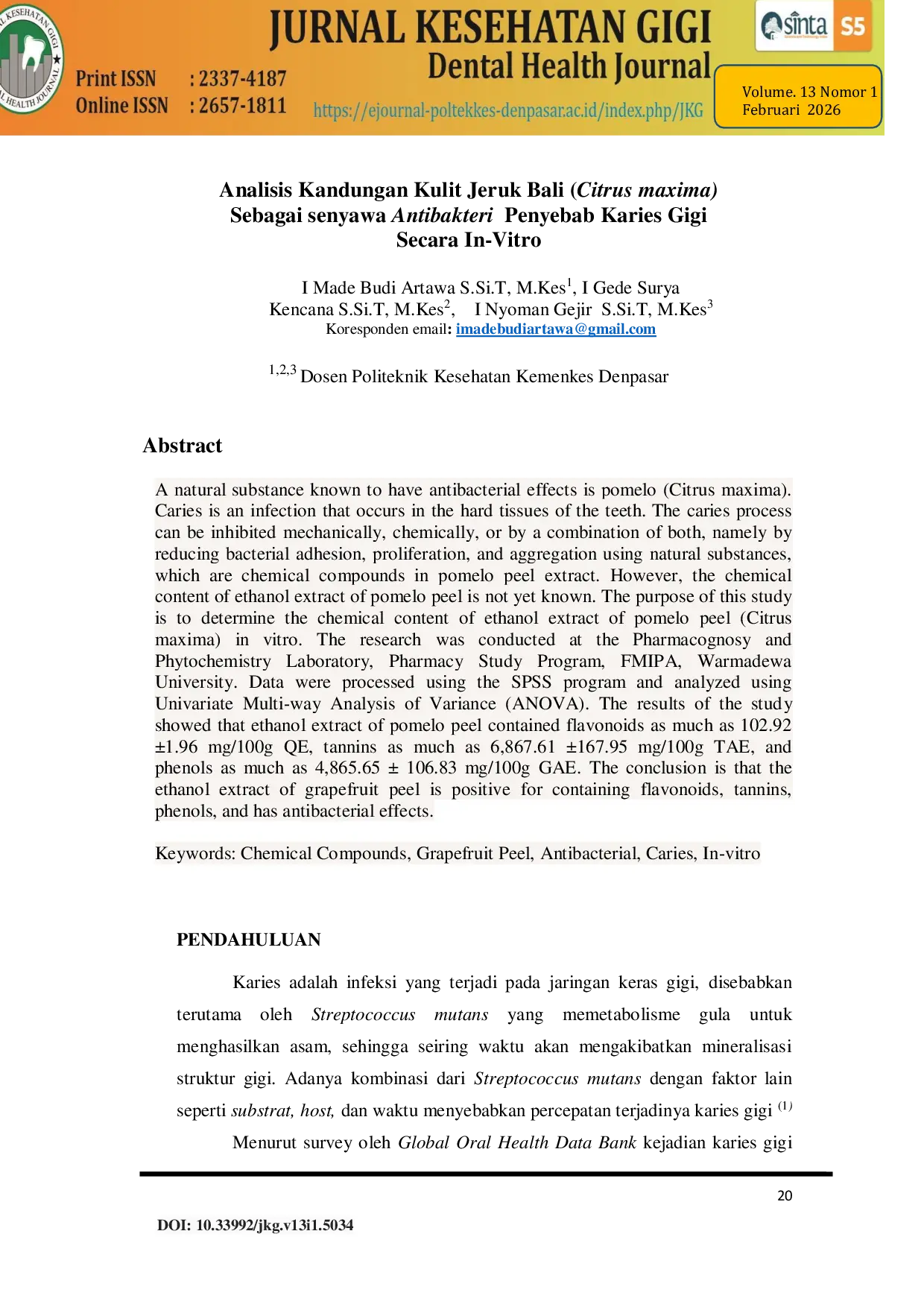Jurnal Kesehatan Gigi (Dental Health Journal)Jurnal Kesehatan Gigi (Dental Health Journal)Karies adalah infeksi yang terjadi pada jaringan keras gigi, disebabkan terutama oleh Streptococcus mutans yang memetabolisme gula untuk menghasilkan asam, sehingga seiring waktu akan mengakibatkan mineralisasi struktur gigi. Proses pembentukan karies gigi dapat dihambat secara mekanis, kimiawi, atau kombinasi keduanya yaitu dengan mengurangi perlekatan, proliferasi dan agregasi bakteri Streptococcus mutans. Salah satu bahan alami yang diketahui memiliki efek antibakteri adalah jeruk bali (Citrus maxima). Tujuan dari penelitian ini adalah untuk mengetahui kandungan senyawa kimia dalam ekstrak kulit jeruk bali secara in-vitro. Hasil penelitian menunjukkan bahwa ekstrak etanol kulit jeruk bali mengandung flavonoid sebesar 102.92 ±1.96 mg/100g QE, tannin sebesar 6,867.61 ±167.95 mg/100g TAE, dan phenols sebesar 4,865.65 ± 106.83 mg/100g GAE. Kesimpulannya, ekstrak etanol kulit jeruk bali positif mengandung flavonoid, tannin, phenols, dan memiliki efek antibakteri.