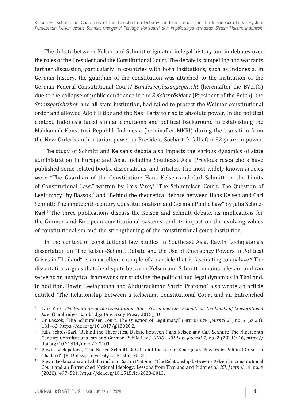 Jurnal KonstitusiJurnal KonstitusiArtikel ini mengkaji perdebatan konstitusional antara Hans Kelsen dan Carl Schmitt pada masa Republik Weimar mengenai lembaga yang paling tepat menjadi penjaga konstitusi serta relevansinya bagi Indonesia. Dengan menggunakan pendekatan historis dan perundang-undangan, penelitian ini menunjukkan bahwa Kelsen menempatkan Mahkamah Konstitusi sebagai penjaga konstitusi, sedangkan Schmitt berpendapat bahwa Presiden lebih tepat menjalankan fungsi tersebut dalam situasi krisis politik. Dalam jangka pendek, pandangan Schmitt tampak lebih sesuai dengan kondisi politik Weimar. Namun, dalam jangka panjang, runtuhnya rezim Nazisme dan berkembangnya peradilan konstitusi pasca-Perang Dunia II justru mengukuhkan model Kelsen, yang berpuncak pada Mahkamah Konstitusi Federal Jerman sebagai penjaga Undang-Undang Dasar. Di Indonesia, Mahkamah Konstitusi secara kelembagaan dirancang untuk menjalankan fungsi tersebut, tetapi berbagai pelanggaran etik dan hukum oleh hakim konstitusi telah melemahkan legitimasi, independensi, dan kredibilitasnya di hadapan publik.