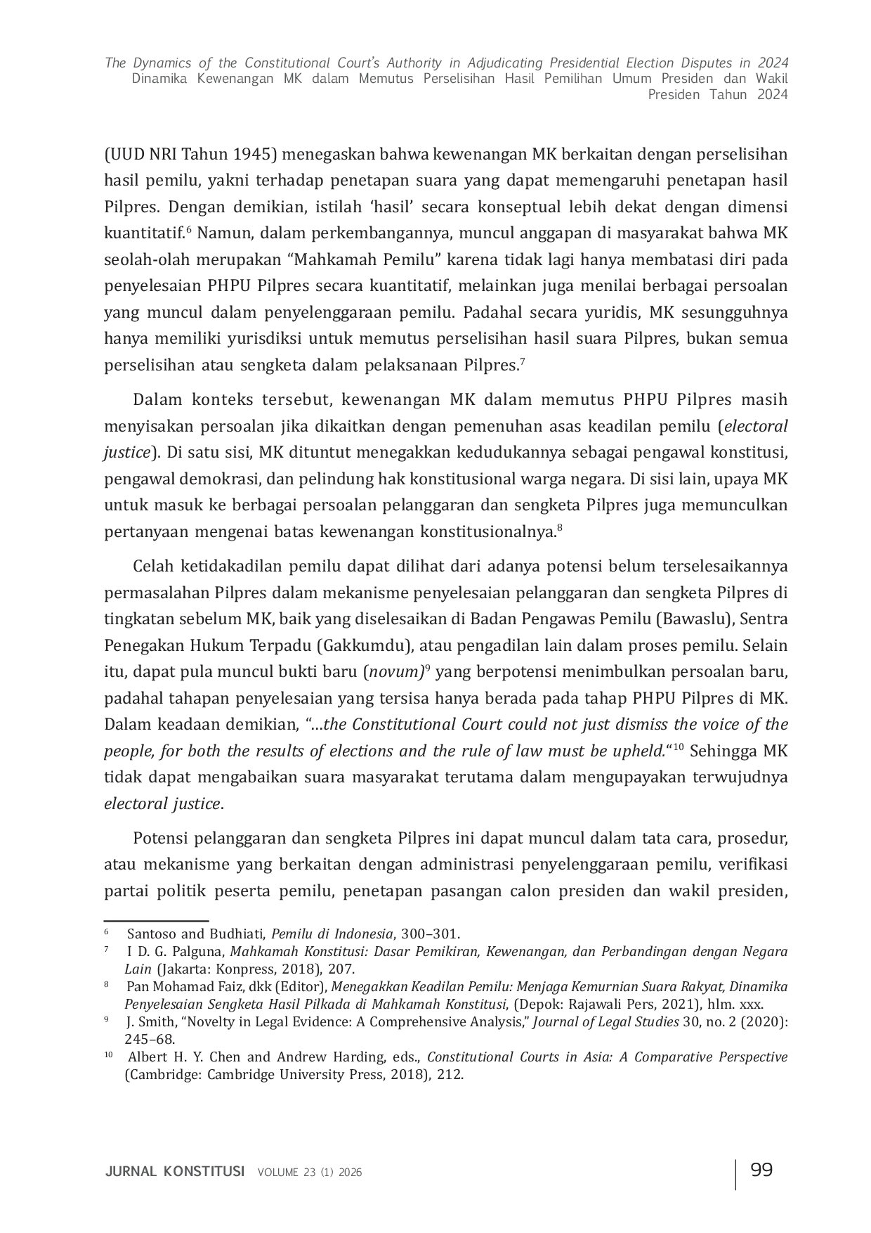 Jurnal KonstitusiJurnal KonstitusiBerdasarkan yurisprudensi Mahkamah Konstitusi, permohonan yang berkaitan dengan perselisihan hasil pemilihan umum presiden terbagi ke dalam dua kategori, yaitu permohonan kuantitatif yang berkaitan dengan hasil perhitungan suara dan permohonan kualitatif yang berkaitan dengan dugaan pelanggaran prosedural atau ketidaksesuaian dalam penyelenggaraan pemilu. Meskipun Mahkamah Konstitusi lebih sering memutus perkara berdasarkan aspek kuantitatif, Mahkamah juga telah mempertimbangkan dalil-dalil kualitatif yang berkaitan dengan pelanggaran pemilu yang dapat merusak legitimasi proses pemilu. Penelitian ini mengkaji dinamika kewenangan Mahkamah Konstitusi dalam memutus perselisihan hasil pemilihan umum presiden dan wakil presiden serta tantangan yang dihadapinya dalam menegakkan prinsip keadilan pemilu. Penelitian ini menyimpulkan bahwa putusan yang tidak tegas, seperti dalam perselisihan hasil pemilihan umum presiden dan wakil presiden tahun 2024, dapat melemahkan persepsi masyarakat terhadap legitimasi pemilu dan semakin menghambat terwujudnya keadilan pemilu. Oleh karena itu, Mahkamah Konstitusi perlu memperkuat prosedur hukum yang jelas dan mencerminkan keadilan pemilu, sekaligus menjaga legitimasi demokrasi Indonesia.
