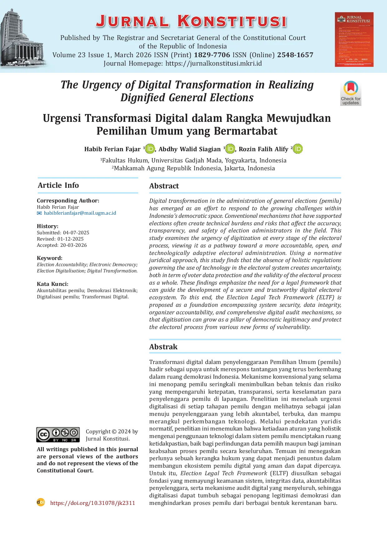 Jurnal KonstitusiJurnal KonstitusiTransformasi digital dalam penyelenggaraan Pemilihan Umum (pemilu) hadir sebagai upaya untuk merespons tantangan yang terus berkembang dalam ruang demokrasi Indonesia. Mekanisme konvensional yang selama ini menopang pemilu seringkali menimbulkan beban teknis dan risiko yang mempengaruhi ketepatan, transparansi, serta keselamatan para penyelenggara pemilu di lapangan. Penelitian ini menelaah urgensi digitalisasi di setiap tahapan pemilu dengan melihatnya sebagai jalan menuju penyelenggaraan yang lebih akuntabel, terbuka, dan mampu merangkul perkembangan teknologi. Melalui pendekatan yuridis normatif, penelitian ini menemukan bahwa ketiadaan aturan yang holistik mengenai penggunaan teknologi dalam sistem pemilu menciptakan ruang ketidakpastian, baik bagi perlindungan data pemilih maupun bagi jaminan keabsahan proses pemilu secara keseluruhan. Temuan ini menegaskan perlunya sebuah kerangka hukum yang dapat menjadi penuntun dalam membangun ekosistem pemilu digital yang aman dan dapat dipercaya. Untuk itu, Election Legal Tech Framework (ELTF) diusulkan sebagai fondasi yang memayungi keamanan sistem, integritas data, akuntabilitas penyelenggara, serta mekanisme audit digital yang menyeluruh, sehingga digitalisasi dapat tumbuh sebagai penopang legitimasi demokrasi dan melindungi proses pemilu dari berbagai kerentanan baru.