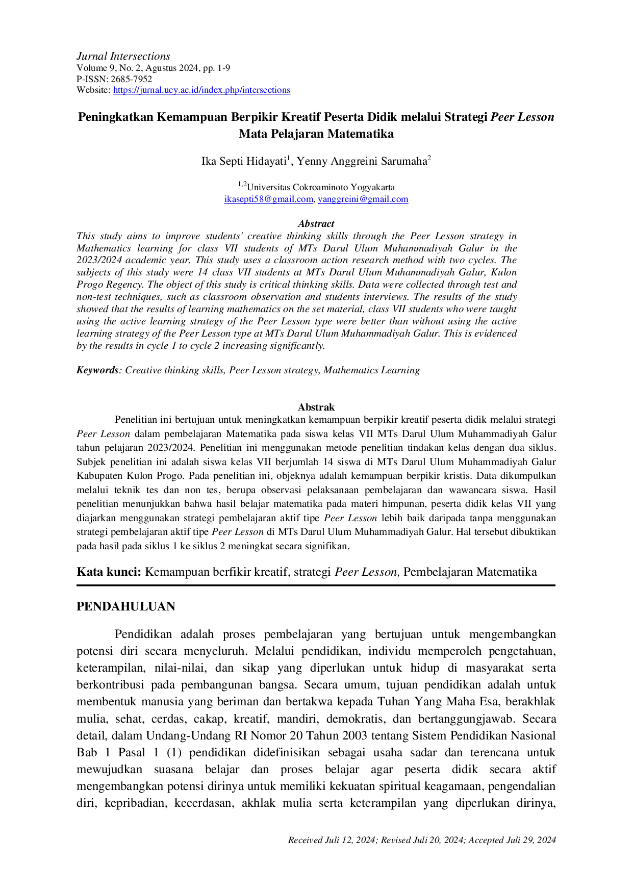 Intersections: Jurnal Pendidikan Matematika Dan MatematikaIntersections: Jurnal Pendidikan Matematika Dan MatematikaPenelitian ini bertujuan untuk meningkatkan kemampuan berpikir kreatif peserta didik melalui strategi Peer Lesson dalam pembelajaran Matematika pada siswa kelas VII MTs Darul Ulum Muhammadiyah Galur tahun pelajaran 2023/2024. Penelitian menggunakan metode penelitian tindakan kelas dengan dua siklus. Subjek penelitian adalah siswa kelas VII berjumlah 14 siswa. Hasil penelitian menunjukkan bahwa hasil belajar matematika pada materi himpunan, peserta didik kelas VII yang diajarkan menggunakan strategi pembelajaran aktif tipe Peer Lesson lebih baik daripada tanpa menggunakan strategi pembelajaran aktif tipe Peer Lesson di MTs Darul Ulum Muhammadiyah Galur. Hal ini dibuktikan pada hasil siklus 1 ke siklus 2 yang meningkat secara signifikan.