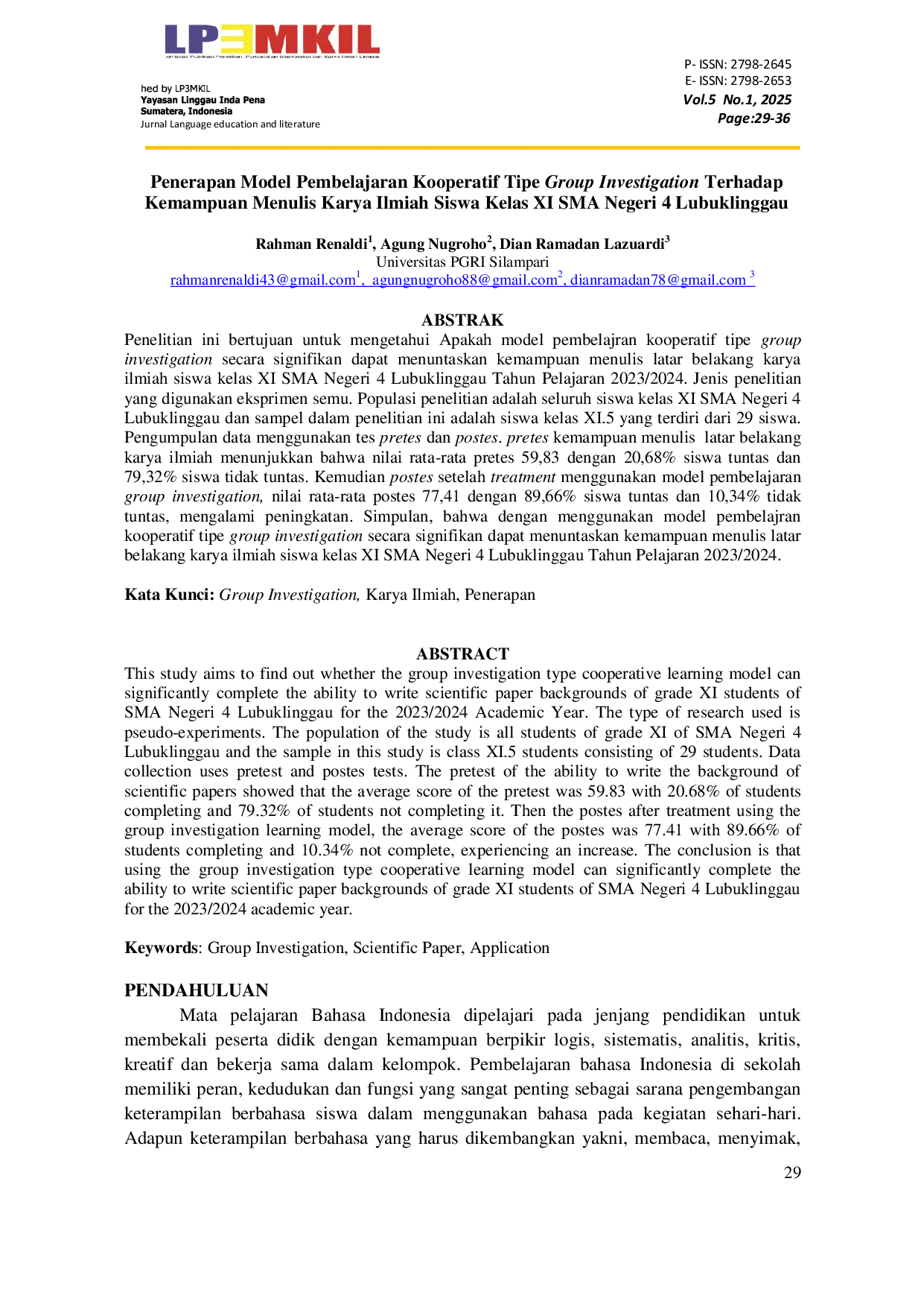 Linggau Jurnal Language Education and LiteratureLinggau Jurnal Language Education and LiteraturePenelitian ini bertujuan untuk mengetahui Apakah model pembelajaran kooperatif tipe group investigation secara signifikan dapat menuntaskan kemampuan menulis latar belakang karya ilmiah siswa kelas XI SMA Negeri 4 Lubuklinggau Tahun Pelajaran 2023/2024. Jenis penelitian yang digunakan eksprimen semu. Populasi penelitian adalah seluruh siswa kelas XI SMA Negeri 4 Lubuklinggau dan sampel dalam penelitian ini adalah siswa kelas XI.5 yang terdiri dari 29 siswa. Pengumpulan data menggunakan tes pretes dan postes. Pretes kemampuan menulis latar belakang karya ilmiah menunjukkan bahwa nilai rata-rata pretes 59,83 dengan 20,68% siswa tuntas dan 79,32% siswa tidak tuntas. Kemudian postes setelah treatment menggunakan model pembelajaran group investigation, nilai rata-rata postes 77,41 dengan 89,66% siswa tuntas dan 10,34% tidak tuntas, mengalami peningkatan. Simpulan, bahwa dengan menggunakan model pembelajaran kooperatif tipe group investigation secara signifikan dapat menuntaskan kemampuan menulis latar belakang karya ilmiah siswa kelas XI SMA Negeri 4 Lubuklinggau Tahun Pelajaran 2023/2024.