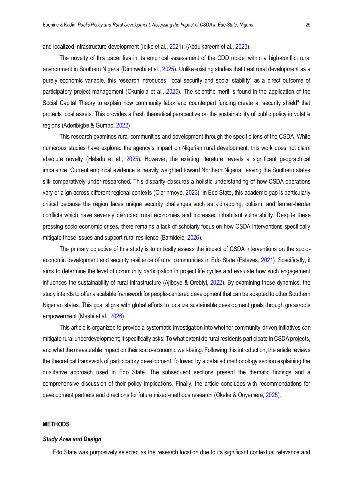 Studi ini menunjukkan bahwa pengembangan yang didorong oleh masyarakat melalui CSDA telah secara signifikan meningkatkan kondisi sosial-ekonomi dan ketahanan keamanan di masyarakat pedesaan di Nigeria, khususnya di Edo State.Partisipasi masyarakat yang aktif dalam pendanaan, penyediaan tenaga kerja, dan pengawasan proyek telah memperkuat kepemilikan, keberlanjutan, dan efektivitas proyek secara keseluruhan.Temuan mengungkapkan bahwa investasi dalam infrastruktur sosial, seperti balai desa, elektrifikasi, skema air, dan stasiun polisi, telah meningkatkan mata pencaharian, kohesi sosial, dan keamanan lokal.Meskipun pencapaian ini, tantangan yang terus berlanjut seperti kemauan politik yang lemah, pendanaan yang tidak memadai, korupsi, dan defisit infrastruktur terus membatasi potensi penuh intervensi pengembangan pedesaan.Studi ini juga menekankan pentingnya mengintegrasikan inovasi teknologi dan keterlibatan pemangku kepentingan inklusif untuk mempertahankan hasil keamanan dan pengembangan.Oleh karena itu, pendekatan holistik yang menggabungkan pengembangan partisipatif, tata kelola yang kuat, dan kerangka kebijakan adaptif sangat penting untuk mencapai transformasi pedesaan jangka panjang.