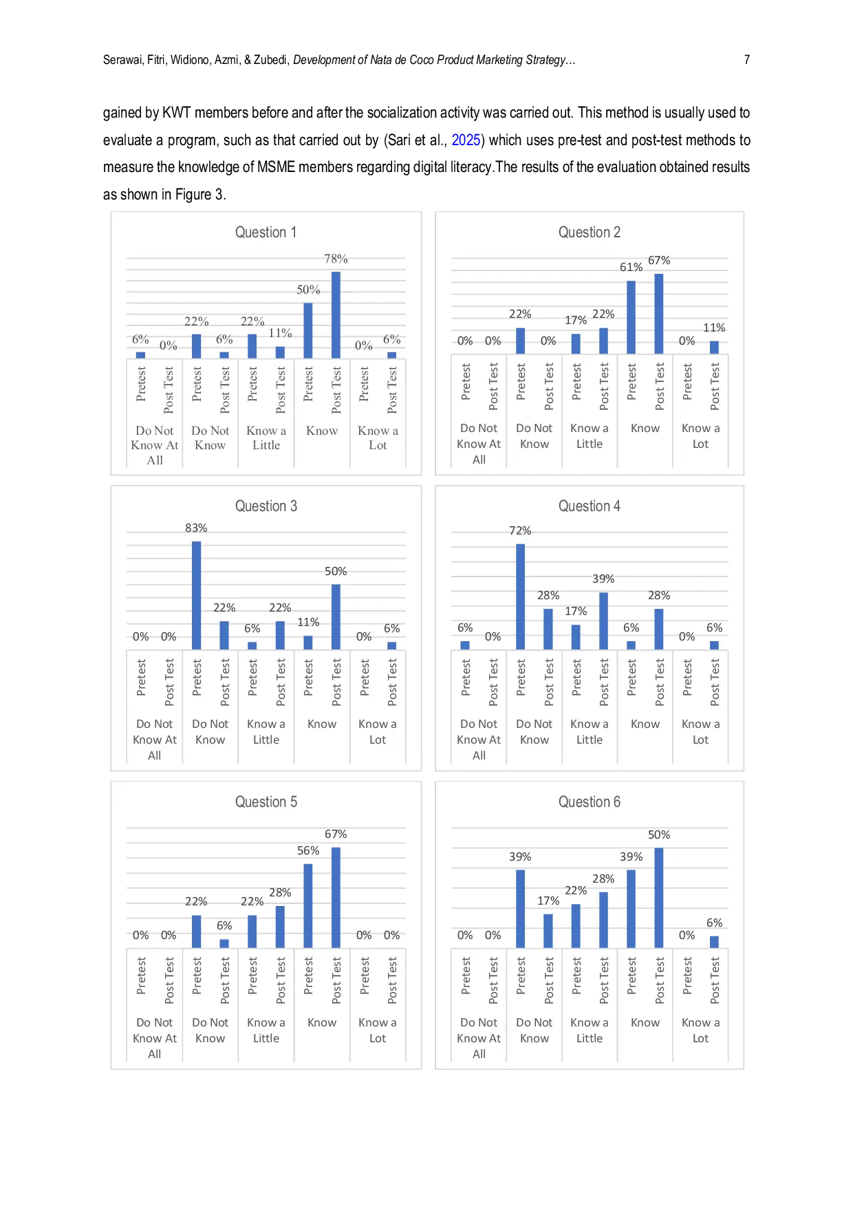 Pertama, penelitian lanjutan dapat menanyakan bagaimana persepsi dan pengalaman KWT dalam menggunakan platform e‑commerce spesifik seperti Shopee atau Tokopedia terhadap peningkatan penjualan Nata de Coco, guna mengidentifikasi hambatan teknis dan pemanfaatan strategi promosi digital yang lebih efektif. Kedua, studi berikutnya dapat mengevaluasi dampak jangka panjang penerapan pocket book digital terhadap kebijakan mikro‑industri wanita, termasuk pengukuran peningkatan pendapatan, diversifikasi produk, dan kapasitas manajemen usaha; hal ini akan menilai keberlanjutan program dan potensi skala ke desa lain. Ketiga, penelitian selanjutnya dapat menjelajahi pengaruh kolaborasi antara KWT dan pelaku pemasaran digital profesional (misalnya influencer atau Content Creator) terhadap kesadaran merek dan loyalitas konsumen, yang bisa membantu memperluas jangkauan pasar Nata de Coco ke segmen konsumen nasional maupun internasional.