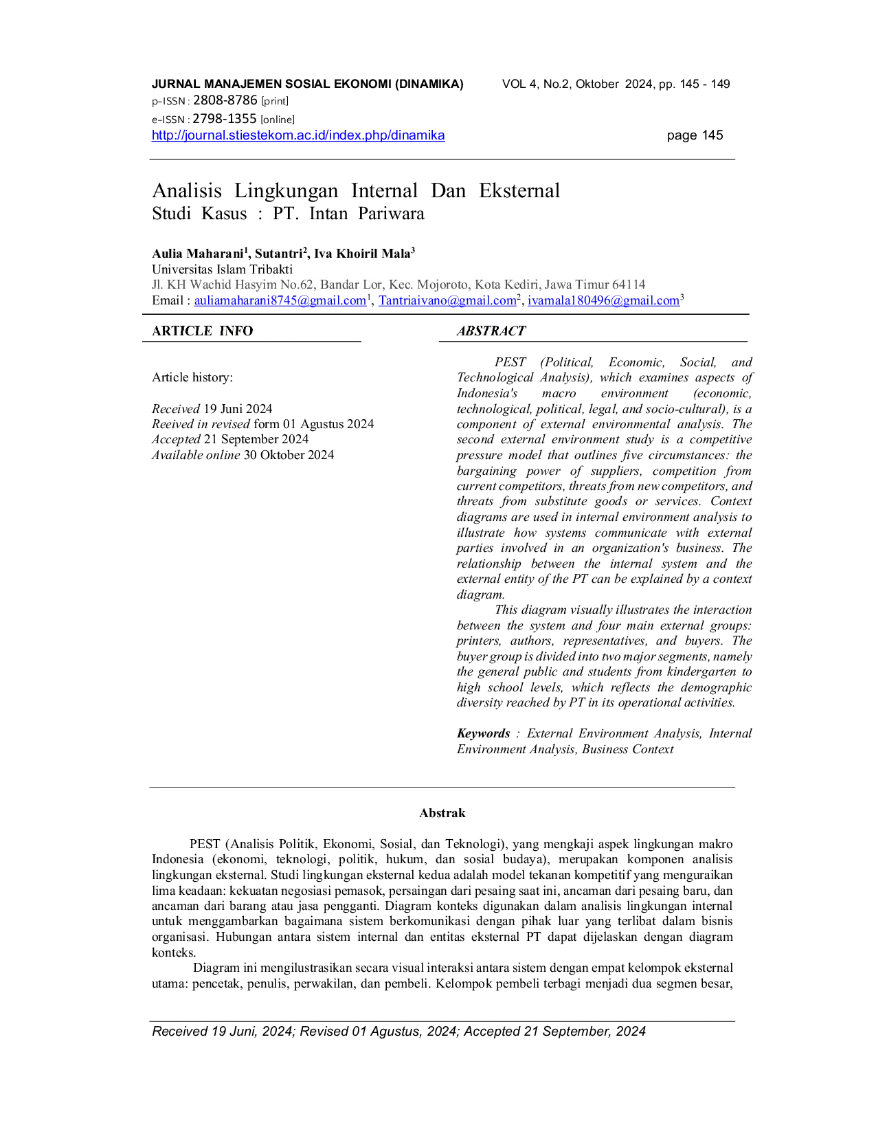 Dinamika: Jurnal Manajemen Sosial EkonomiDinamika: Jurnal Manajemen Sosial EkonomiPEST (Analisis Politik, Ekonomi, Sosial, dan Teknologi), yang mengkaji aspek lingkungan makro Indonesia (ekonomi, teknologi, politik, hukum, dan sosial budaya), merupakan komponen analisis lingkungan eksternal. Studi lingkungan eksternal kedua adalah model tekanan kompetitif yang menguraikan lima keadaan: kekuatan negosiasi pemasok, persaingan dari pesaing saat ini, ancaman dari pesaing baru, dan ancaman dari barang atau jasa pengganti. Diagram konteks digunakan dalam analisis lingkungan internal untuk menggambarkan bagaimana sistem berkomunikasi dengan pihak luar yang terlibat dalam bisnis organisasi. Hubungan antara sistem internal dan entitas eksternal PT dapat dijelaskan dengan diagram konteks. Diagram ini mengilustrasikan secara visual interaksi antara sistem dengan empat kelompok eksternal utama: pencetak, penulis, perwakilan, dan pembeli. Kelompok pembeli terbagi menjadi dua segmen besar, yaitu masyarakat umum dan pelajar dari tingkat TK hingga SMA, yang mencerminkan keragaman demografis yang dijangkau oleh PT dalam kegiatan operasionalnya.