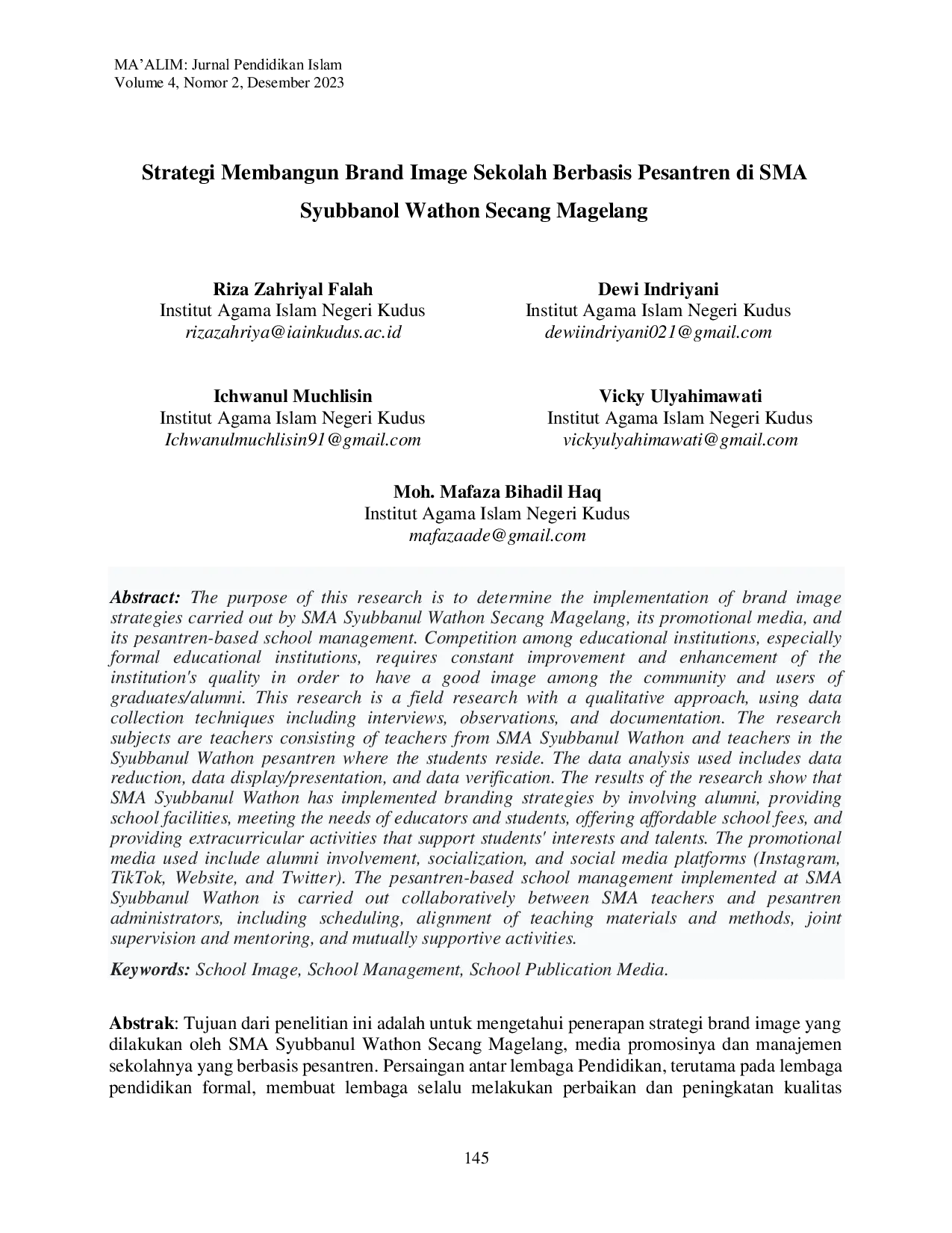 MA'ALIM: Jurnal Pendidikan IslamMA'ALIM: Jurnal Pendidikan IslamTujuan dari penelitian ini adalah untuk mengetahui penerapan strategi brand image yang dilakukan oleh SMA Syubbanul Wathon Secang Magelang, media promosinya dan manajemen sekolahnya yang berbasis pesantren. Persaingan antar lembaga Pendidikan, terutama pada lembaga pendidikan formal, membuat lembaga selalu melakukan perbaikan dan peningkatan kualitas lembaga, untuk memiliki image yang baik dikalangan masyarakat dan pengguna lulusan/alumni. Penelitian ini merupakan penelitian lapangan dengan pendekatan kualiltatif dengan teknik pengumpulan data meliputi wawancara, observasi, dan dokumentasi. Subjek penelitian dalah guru yang terdiri dari dari guru SMA Syubbanul Wathon dan guru di lingkungan pesantren Syubbanul Wathon tempat siswa tinggal. Analisis data yang digunakan berupa reduksi data, display/penyajian data, dan verifikasi data. Hasil penelitian menunjukkan bahwa SMA Syubbanol Wathon sudah menerapkan strategi branding dengan cara menggunakan peran alumni,melengkapi fasilitas sekolah,memenuhi SDM pendidik maupun peserta didik,biaya sekolah yang terjangkau dan adanya kegiatan ekstrakulikuler yang menunjang minat bakat siswa. Media publikasinya menggunakan peran alumni,sosialiasasi dan media sosial (Instagram,Tiktok,Website dan Twitter). Manajemen sekolah berbasis pesantren yang dilaksanakan di SMA Syubbanul Wathon dilaksanakan secara kolaboratif antara guru SMA dan pengurus pesantren dengan bentuk penataan jadwal, penyelarasan materi dan metode pembelajaran, pengawasan dan pembinaan secara bersama-sama, dan bentuk kegiatan yang saling menunjang.