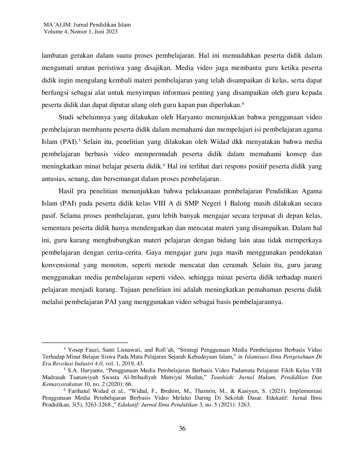MA'ALIM: Jurnal Pendidikan IslamMA'ALIM: Jurnal Pendidikan IslamPengajaran pendidikan agama Islam biasanya hanya melibatkan ceramah dan kurang memanfaatkan media pembelajaran, sehingga pembelajaran menjadi kurang efektif dan menarik bagi peserta didik. Penelitian ini bertujuan untuk meningkatkan pemahaman peserta didik di SMP Negeri 1 Balong kelas VIII A dengan mengimplementasikan media pembelajaran pendidikan agama Islam berbasis video. Studi ini menggunakan metode kualitatif deskriptif dengan teknik pengumpulan data melalui wawancara semi terstruktur, observasi non partisipan, dan dokumentasi. Sedangkan, analisis data menggunakan interaktif yang terdiri dari pengumpulan data, kondensasi data, penyajian data, dan penarikan kesimpulan. Untuk pengujian keabsahan data, peneliti menggunakan triangulasi sumber. Hasil penelitian menunjukkan bahwa penggunaan video sebagai media pembelajaran meningkatkan antusiasme peserta didik dan pemahaman peserta didik terhadap mata pelajaran pendidikan agama Islam. Selain itu, penggunaan media pembelajaran berbasis video meningkatkan efektivitas dan efisiensi guru dalam menyampaikan materi kepada peserta didik.