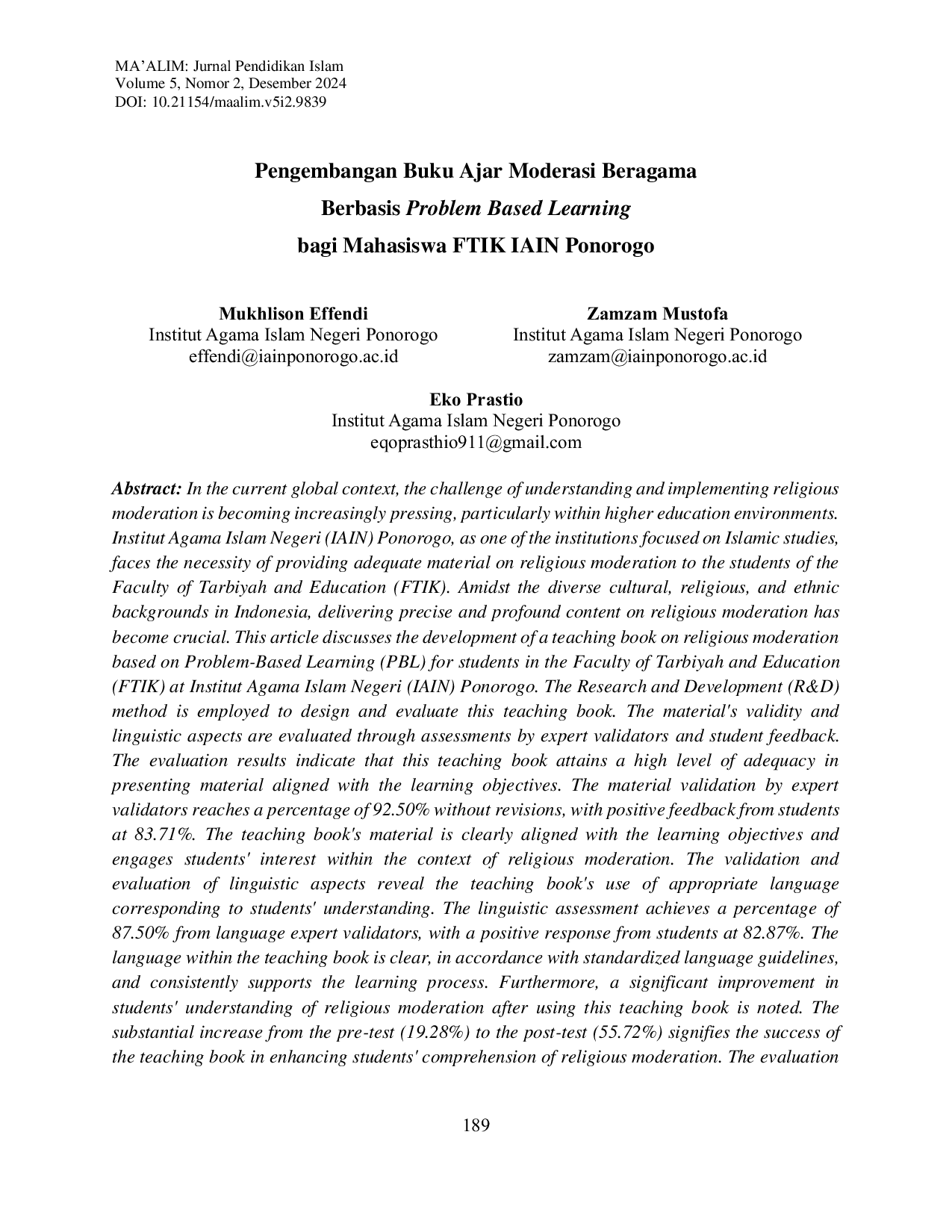 - Pengembangan Buku Ajar Moderasi Beragama Berbasis Problem Based Learning bagi Mahasiswa FTIK IAIN Ponorogo... jurnal.iainponorogo.ac.id/index.php/maalim/article/view/9839Pengembangan Buku Ajar Moderasi Beragama Berbasis Problem Based Learning bagi Mahasiswa FTIK IAIN Ponorogo jurnal iainponorogo ac index php maalim article view 9839
