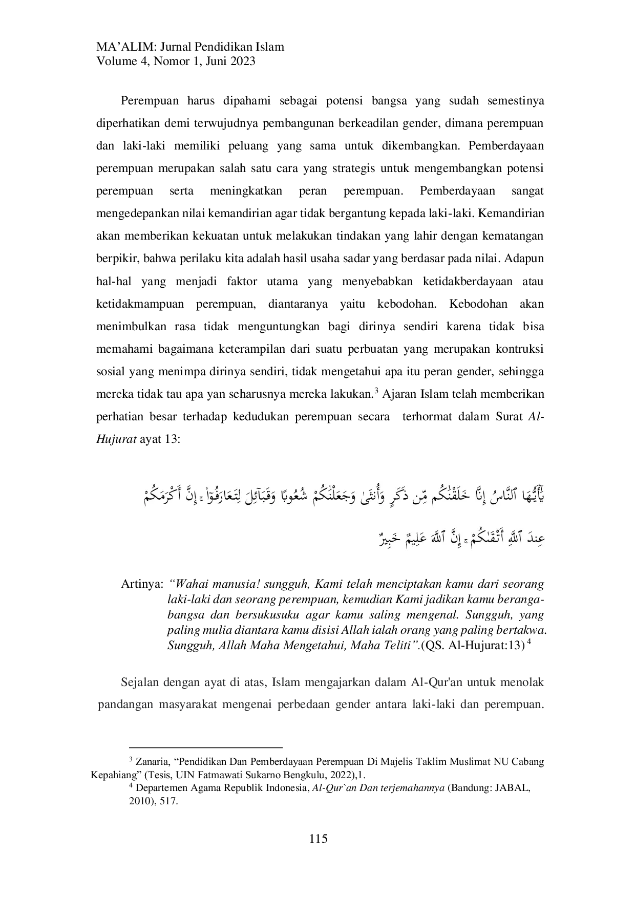 MA'ALIM: Jurnal Pendidikan IslamMA'ALIM: Jurnal Pendidikan IslamStereotipe yang menganggap perempuan itu lemah, sangat bergantung pada laki-laki, dan tidak bisa mandiri masih banyak ditemukan hingga saat ini, tidak terkecuali di Desa Papungan, Kecamatan Pitu, Kabupaten Ngawi. Penelitian ini bertujuan untuk mengetahui peranan muslimat Nahdhatul Ulama Desa Papungan dalam pemberdayaan perempuan pada bidang sosial keagamaan. Penelitian ini menggunakan pendekatan kualitatif. Analisis data yang dari konsep Milles dan Hubberman yaitu reduksi data, penyajian data, dan penarikan kesimpulan. Hasil penelitian pertama, peranan Muslimat Nahdhatul Ulama dalam pemberdayaan adalah dengan cara mendidik, membimbing, melatih, dan mengarahkan melalui kegiatan yasinan, tadarus al-Qur`an, banjari al-Barjanji, dan Pengajian. Kedua, faktor pendukung yang mempengaruhi pemberdayaan adalah dukungan dari kepala desa, semangat partisipasi dari anggota, dan sarana prasarana. Sedangkan faktor penghambatnya adalah kurang optimalnya motivasi, disiplin waktu, siuasi dan kondisi serta perbedaan latar belakang. Ketiga, dampak gerakan Muslimat dalam konteks ruhaniyah, perubahan yang dialami masyarakat yaitu dapat meningkatkan iman takwa dan memperlancar ibu-ibu dalam membaca al-Qur`an. Sedangkan dalam konteks intelektual, penambahan pengetahuan yang baru, dan optimalisasi bakat dalam kegiatan banjari dan al-Barjanji. Sedangkan dalam konteks ekonomi, kegiatan yang dapat membentuk perubahan pada ibu-ibu yaitu menambah pemasukan melalui bisyaroh ketika ada tawaran hadroh dan memimpin yasinan.