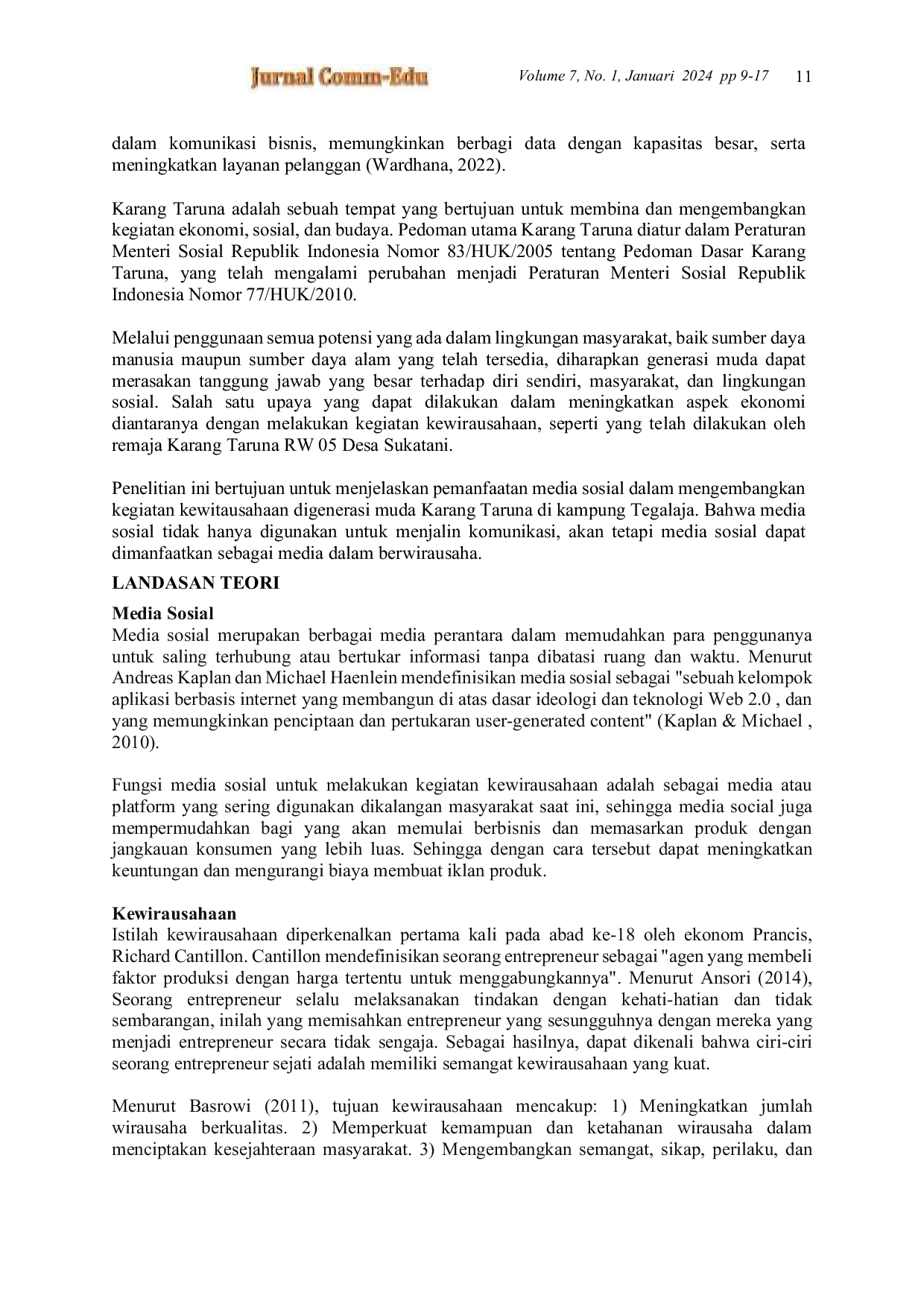 Comm-EduComm-EduPenelitian ini bertujuan dalam menjelaskan pemanfaat dari media sosial yang dapat membantu sebagai media dalam kegiatan berwirausaha oleh Karang Taruna RW 05 Desa Sukatani. Fungsi media sosial sering disebut juga sebagai media atau platform yang sering digunakan dikalangan masyarakat saat ini dalam memudahkan bagi setiap orang yang akan memulai berbisnis dan memasarkan produk dengan jangkauan konsumen yang lebih luas. Sehingga dengan cara tersebut dapat meningkatkan keuntungan dan mengurangi biaya membuat iklan produk. Metode penelitian ini menggunakan metode deskriptif kualitatif karena dalam fokus penelitian kali ini ialah memperhatikan perkembangan sosial dan ekonomi masyarakat secara faktual. Pengumpulan data dilakukan dengan wawancara, observasi dan dokumentasi, yang terbagi menjadi data primer dan data sekunder. Dapat disimpulkan bahwa masih banyak pemuda yang tergabung dalam organisasi Karang Taruna di Desa Sukatani belum memanfaatkan semaksimal mungkin media sosial sebagai penunjang dalam melakukan kegiatan kewirausahaan. Untuk mengatasi hal tersebut pertama-tama yang dilakukan ialah membuat akun media sosial yang khusus digunakan untuk mempromosikan produk-produk penjualan sehingga tersebar luas.