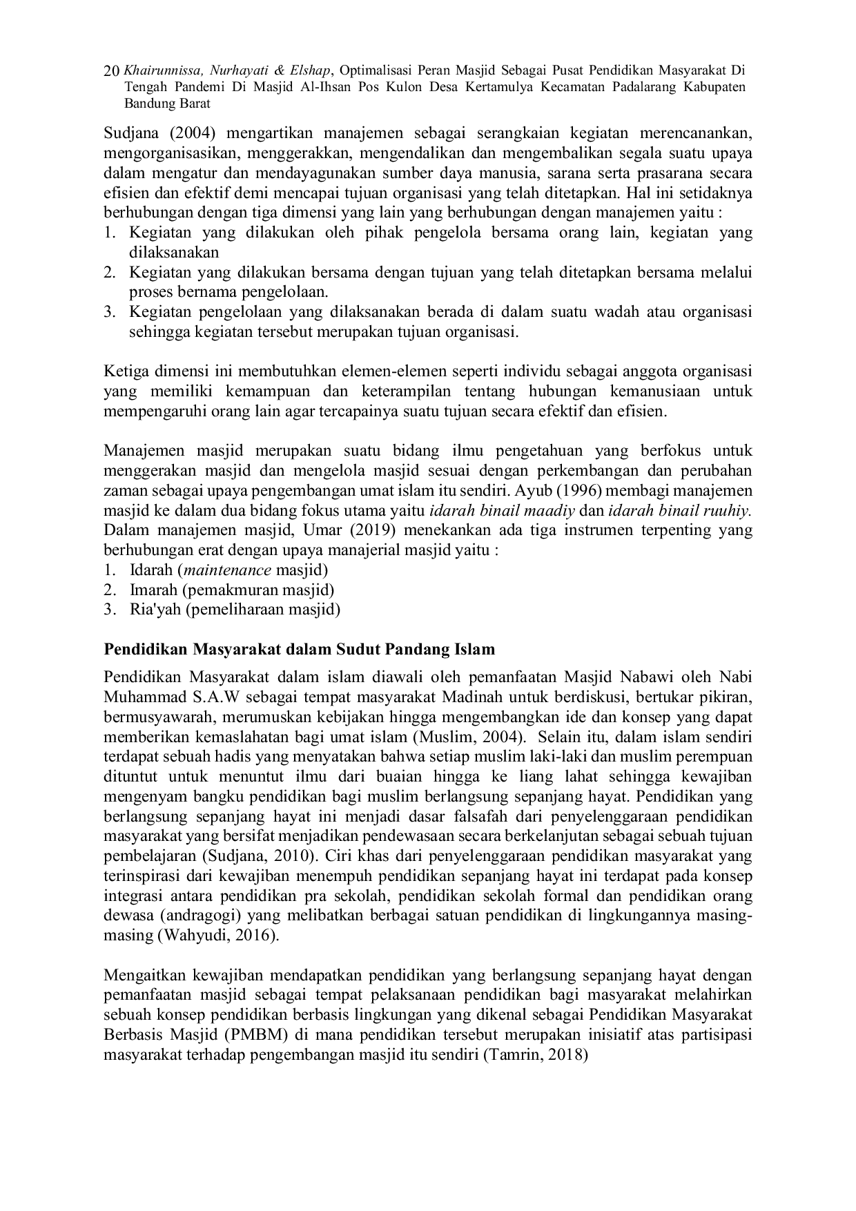 Berdasarkan hasil penelitian di atas, peneliti berkesimpulan bahwa masjid sebagai pusat pendidikan masyarakat memiliki peran yang sangat vital bagi pengembangan masyarakat.Peran masjid sebagai pusat pendidikan menyokong paradigma bahwa masjid merupakan pusat peradaban bagi umat islam.Di masa pandemi di mana resiliensi sosial masyarakat perlu diperkuat, optimalisasi kegiatan masjid dianggap perlu dilaksanakan melalui revitalisasi fungsi masjid melalui unit-unit kegiatan pendidikan bagi masyarakat yang berbasis di masjid.Dengan mengoptimalisasi kegiatan masjid sebagai pusat pendidikan masyarakat, diharapkan peran masjid sebagai institusi sosial dapat membangun mental masyarakat pembelajar (learning society).