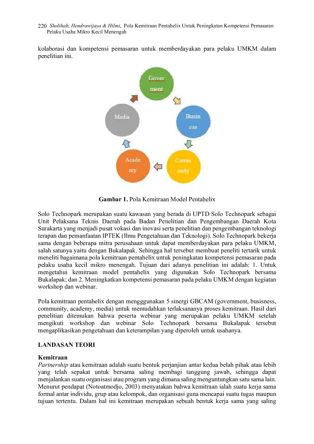Comm-EduComm-EduKemitraan adalah kerja sama antara dua mitra atau lebih yang secara bersama-sama saling menguntungkan untuk membuat suatu kegiatan dengan menggunakan pola kemitraan model pentahelix. Pentahelix yang terdiri dari 5 sinergi pemangku kepentingan GBCAM (Government, Business, Community, Academy, Media). Kemitraan kolaborasi antara Solo Technopark dan Bukalapak disetujui dengan adanya perjanjian kerja sama dan MoU yang sah secara hukum dan SOP yang berlaku. Kegiatan yang dilakukan yaitu dalam bentuk workshop dan webinar. Kegiatan ini dilakukan karena masih banyak pelaku usaha yang belum begitu paham terkait pemasaran. Dengan begitu Solo Technopark bersama Bukalapak ingin menjadikan para pelaku UMKM lebih maju dan mampu meningkatkan sumber daya manusia melalui workshop dan webinar. Materi yang disampaikan berupa marketix mix 4P yang terdiri dari product, price, place, promotion. Dengan tujuan agar mereka mampu menyerap materi yang disampaikan dan dapat meningkatkan kompetensi pemasaran.