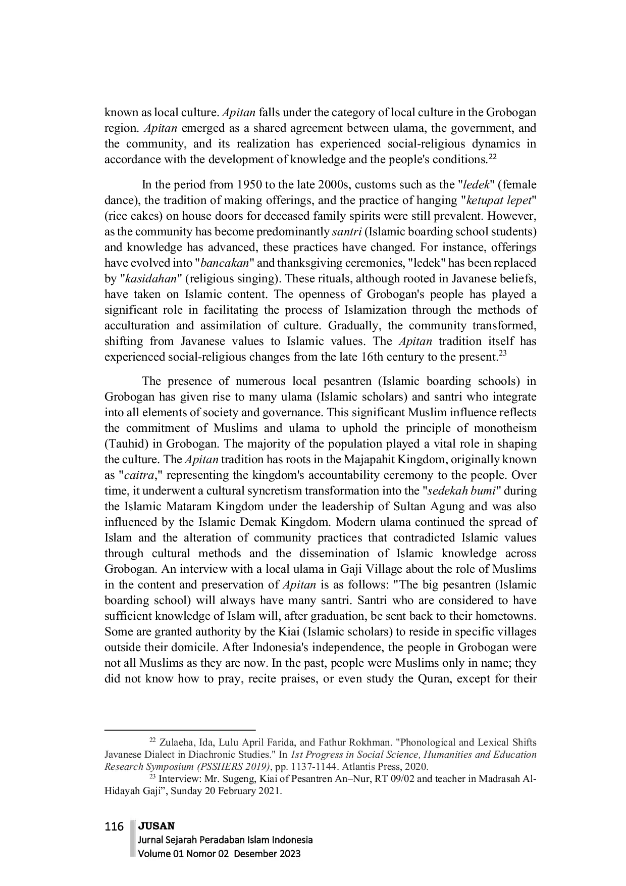 JUSAN: Jurnal Sejarah Peradaban Islam IndonesiaJUSAN: Jurnal Sejarah Peradaban Islam IndonesiaApitan, a longstanding tradition in Grobogan, Central Java, has its roots in the Hindu-Buddhist era. This cultural practice has significantly shaped and transformed the socio-economic and religious landscape of the community, making it imperative to investigate how Apitan has influenced the social, economic, and religious dynamics of Grobogan in the 20th century. This research employs a historical approach with a social perspective. The findings of this study reveal that Apitan bestows numerous benefits upon the Grobogan community. Notably, it fosters camaraderie not only among fellow Muslims but also between individuals of different faiths. Furthermore, this tradition serves as a means of disseminating historical insights, perpetuated through community rituals. From a socio-economic standpoint, it has evolved over time, primarily functioning as a platform for the promotion and introduction of halal food and a halal lifestyle. In the pre-independence era, marked by challenging circumstances and limited education, the accessibility of non-halal food forced the populace to consume it. Although Apitan continues to be celebrated annually, local traditions face significant challenges in the modern global era. The younger generation is progressively less engaged and interested in the Apitan tradition. This predicament necessitates a multi-faceted approach, addressing both the challenges of the times and finding solutions to preserve the local Muslim communitys traditions.