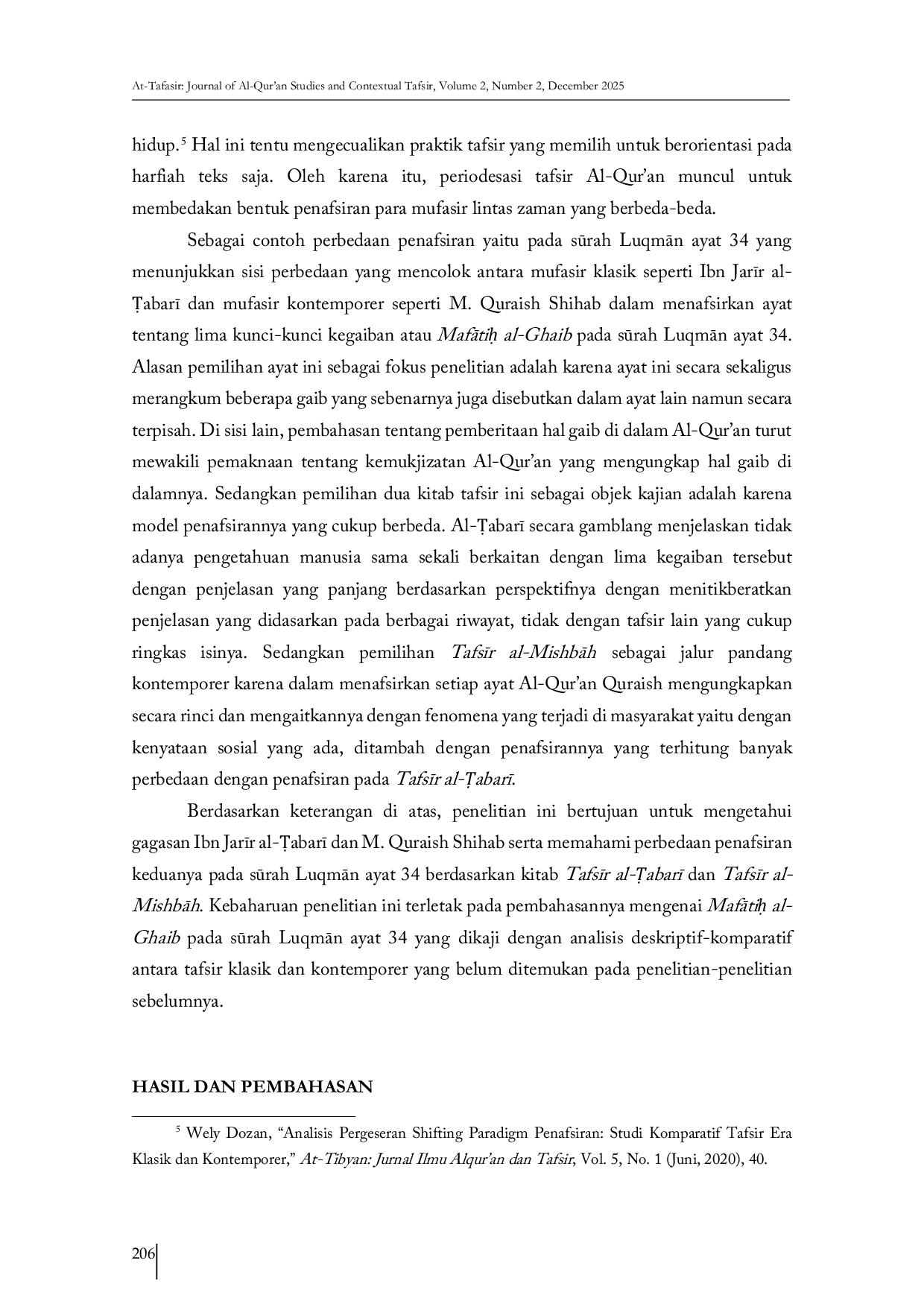 At-Tafasir: Journal of Quranic Studies and Contextual TafsirAt-Tafasir: Journal of Quranic Studies and Contextual TafsirPerbedaan penafsiran antara mufassirs mengenai sebuah ayat atau surah Al-Quran sering ditemukan. Penelitian ini bertujuan untuk menganalisis interpretasi Al-Ṭabarī dan Quraish serta memahami perbedaan interpretasi mereka tentang surah Luqmān ayat 34 berdasarkan buku Tafsīr al-Ṭabarī dan Tafsīr al-Mishbāh. Penelitian menggunakan pendekatan kualitatif dengan analisis komparatif. Data dikumpulkan menggunakan teknik dokumentasi dari kedua buku tersebut. Hasil penelitian menunjukkan bahwa Al-Ṭabarī melihat lima unsur gaib sebagai mutlak, sedangkan Quraish melihat beberapa sebagai mutlak dan lainnya sebagai relatif. Perbedaan mereka terutama terlihat dalam menafsirkan turunnya hujan dan apa yang ada dalam rahim, dengan Al-Ṭabarī menganggapnya sebagai rahasia mutlak dan Quraish melihatnya sebagai relatif. Namun, keduanya menafsirkan waktu kiamat, apa yang akan dilakukan seseorang besok, dan di mana seseorang akan meninggal sebagai rahasia mutlak. Perbedaan ini mungkin berasal dari pergeseran metodologis dan konteks sosial yang berbeda saat interpretasi, serta sumber pendapat yang berbeda.