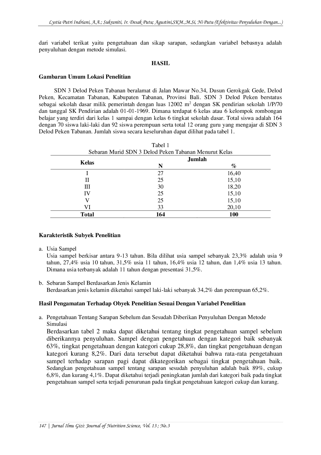 Jurnal Ilmu Gizi : Journal of Nutrition ScienceJurnal Ilmu Gizi : Journal of Nutrition ScienceSarapan sangat penting bagi siswa sekolah dasar, terutama untuk menjaga konsentrasi belajar dan mendukung prestasi di sekolah. Banyak siswa sekolah dasar yang mengabaikan sarapan sebelum pergi ke sekolah karena kurangnya pengetahuan tentang sarapan. Oleh karena itu, edukasi diperlukan untuk meningkatkan pengetahuan dan sikap siswa sekolah dasar tentang sarapan. Penelitian ini bertujuan untuk menentukan efektivitas penyuluhan dengan metode simulasi terhadap pengetahuan dan sikap tentang sarapan pada siswa sekolah dasar. Jenis penelitian ini adalah eksperimen kuasi dengan desain penelitian one group pretest-posttest. Teknik pengambilan sampel menggunakan proportional random sampling. Total populasi adalah 88 orang dengan total sampel 73 orang. Penelitian ini dilakukan pada Januari-Mei 2019. Instrumen pengumpulan data menggunakan kuesioner tentang sarapan. Hasil penelitian menunjukkan adanya perubahan pengetahuan dan sikap tentang sarapan. Pengujian hipotesis menggunakan Paired T-Test sampel diperoleh nilai p (sig. 2-tailed) pengetahuan sebesar 0,000 dan nilai p (sig. 2-tailed) sikap sarapan sebesar 0,024. Disimpulkan bahwa penyuluhan menggunakan metode simulasi efektif dalam meningkatkan pengetahuan dan sikap tentang sarapan bagi siswa di SDN 3 Delod Peken Tabanan. Diharapkan petugas penyuluh di sekolah dapat meningkatkan dan mengembangkan penyediaan materi tentang sarapan kepada siswa sekolah dasar dengan menggunakan metode dan media yang lebih menarik dan sesuai dengan perkembangan anak seperti metode simulasi dengan media monopoli sarapan.