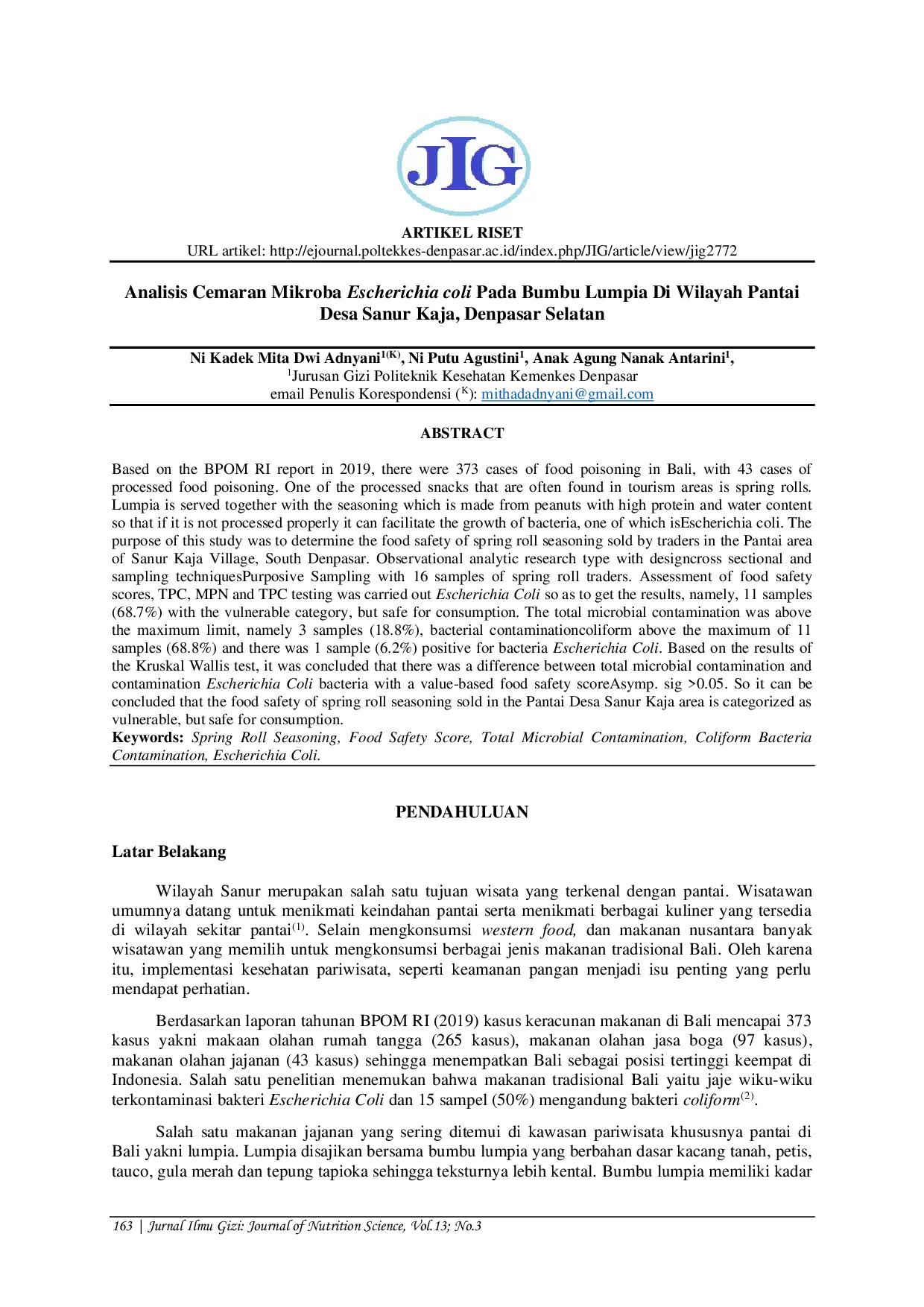 Jurnal Ilmu Gizi : Journal of Nutrition ScienceJurnal Ilmu Gizi : Journal of Nutrition ScienceLaporan BPOM RI 2019 menunjukkan terdapat 373 kasus keracunan makanan di Bali, di antaranya 43 kasus terkait jajanan olahan. Pada jajanan tersebut, bumbu lumpia yang berbahan dasar kacang tanah, petis, tauco, gula merah, dan tepung tapioka dapat menjadi media penyebaran bakteri Escherichia coli bila tidak diolah dan disimpan dengan benar. Penelitian ini bertujuan untuk menilai keamanan pangan bumbu lumpia yang dijual di wilayah pantai Desa Sanur Kaja melalui pengukuran skor keamanan pangan mikrobiologi (Total Plate Count, MPN Coliform, dan deteksi E. coli) pada 16 sampel pedagang lumpia. Hasil menunjukkan bahwa 68,7 % sampel berada dalam kategori rawan namun aman dikonsumsi, 18,8 % melebihi batas maksimum TPC, 68,8 % memiliki coliform melebihi limit, dan 6,2 % terdeteksi positif E. coli. Analisis statistik Kruskal‑Wallis mengonfirmasi terdapat perbedaan signifikan antara skor keamanan pangan dengan TPC serta E. coli, sedangkan tidak ada perbedaan dengan coliform. Temuan ini menyoroti pentingnya penguatan praktik hygiene, sanitasi, dan pelatihan keamanan pangan bagi pedagang lumpia di kawasan wisata pantai.