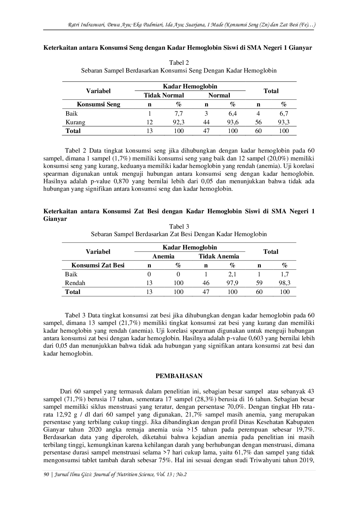 Jurnal Ilmu Gizi : Journal of Nutrition ScienceJurnal Ilmu Gizi : Journal of Nutrition ScienceYoung women are susceptible to nutritional problems, one of which is anemia. The cause of anemia is the lack of consumption of macro and micronutrients, such as iron and zinc. The problem of anemia in adolescent girls will cause adverse effects such as causing babies born with low weight, stunting babies, and high prenatal mortality. The purpose of this study was to determine the relationship between zinc and iron consumption and hemoglobin levels in high school students Negeri 1 Gianyar. The type of data in this study is analytical using a cross sectional design. The population in this study was grade 11 and 12 students with a sample of 60 people selected by random sampling. Data on zinc and iron consumption were obtained using a 24-hour food recall questionnaire processed using the 2007 Nutri Survey program, and hemoglobin levels were obtained by digital multicheck method, namely with GCHb Easy Touch. Data were analyzed using bivariate analysis using the spearman rank test. The results showed the level of zinc and iron consumption was still lacking. The average consumption of zinc and iron after the data was processed was zinc consumption which was 4.3 mg and iron consumption which was 3.95 mg. Consumption of zinc and iron is lower than the daily needs, namely zinc 9 mg and iron 15 mg. There was no significant association (p>0.05) between zinc consumption and hemoglobin levels. There was no significant association (p>0.05) between iron and hemoglobin levels in adolescent girls.