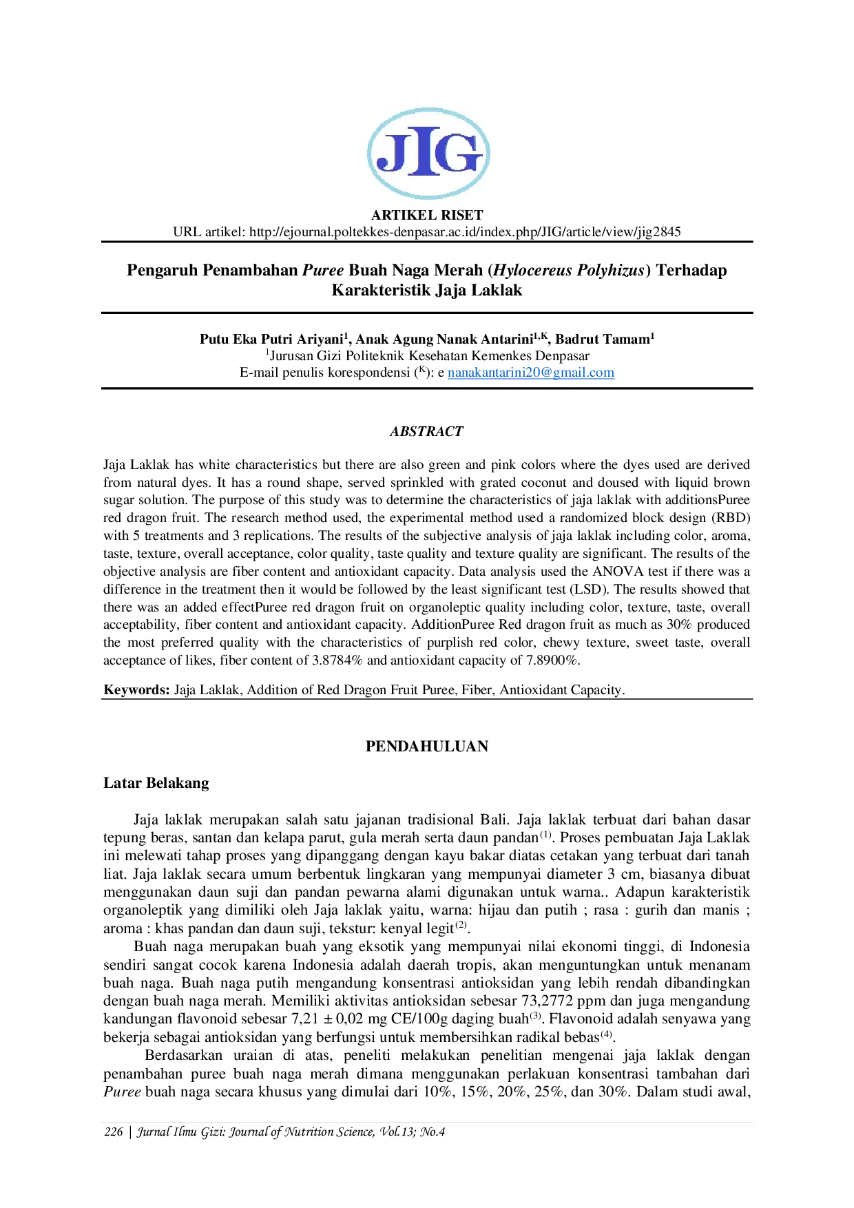 Penambahan puree buah naga merah pada jaja laklak meningkatkan karakteristik organoleptik seperti warna, tekstur, dan rasa, serta menambah kandungan serat dan antioksidan.Perlakuan terbaik adalah 30 % puree, yang menghasilkan produk dengan warna merah keunguan, tekstur kenyal, rasa manis, dan penerimaan keseluruhan tinggi.Jaja laklak yang diperkaya puree buah naga merah dapat menjadi snack inovatif dengan nilai gizi yang lebih baik atas dasar serat dan antioxidant.