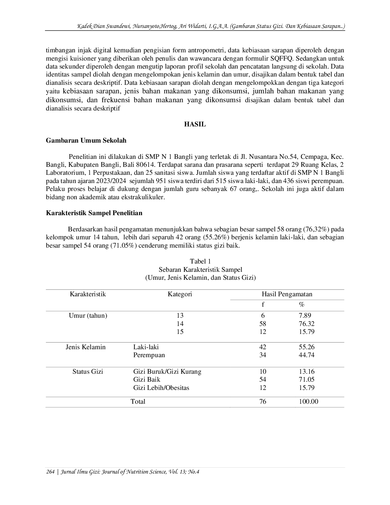 Status gizi siswa SMP Negeri 1 Bangli sebagian besar baik, namun kebiasaan sarapan tidak sesuai anjuran mayoritas.Kebiasaan sarapan yang buruk berhubungan dengan peningkatan obesitas di kalangan siswa.Diperlukan intervensi edukatif berkelanjutan untuk meningkatkan kualitas sarapan siswa.