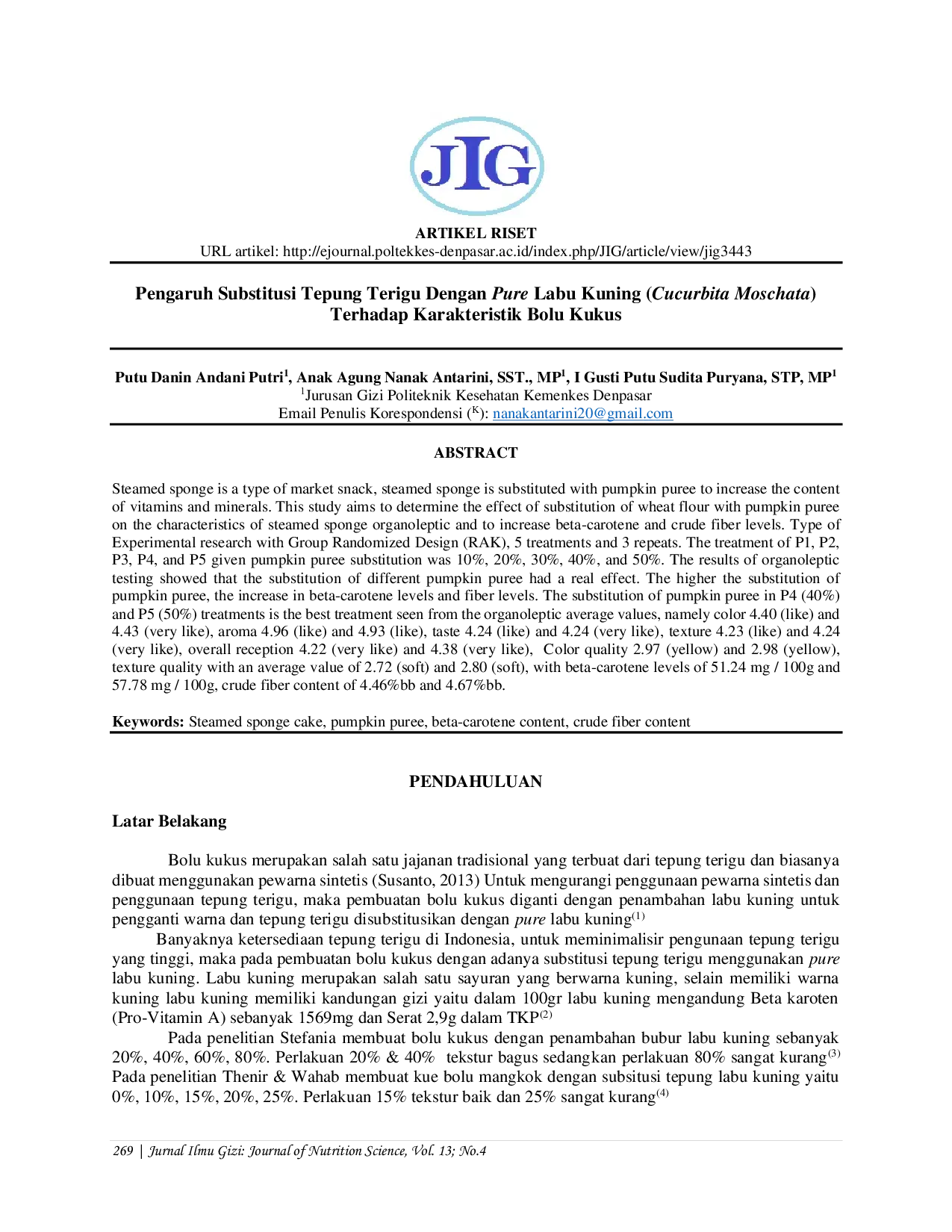 Jurnal Ilmu Gizi : Journal of Nutrition ScienceJurnal Ilmu Gizi : Journal of Nutrition ScienceSteamed sponge is a type of market snack, steamed sponge is substituted with pumpkin puree to increase the content of vitamins and minerals. This study aims to determine the effect of substitution of wheat flour with pumpkin puree on the characteristics of steamed sponge organoleptic and to increase beta-carotene and crude fiber levels. Type of Experimental research with Group Randomized Design (RAK), 5 treatments and 3 repeats. The treatment of P1, P2, P3, P4, and P5 given pumpkin puree substitution was 10%, 20%, 30%, 40%, and 50%. The results of organoleptic testing showed that the substitution of different pumpkin puree had a real effect. The higher the substitution of pumpkin puree, the increase in beta-carotene levels and fiber levels. The substitution of pumpkin puree in P4 (40%) and P5 (50%) treatments is the best treatment seen from the organoleptic average values, namely color 4.40 (like) and 4.43 (very like), aroma 4.96 (like) and 4.93 (like), taste 4.24 (like) and 4.24 (very like), texture 4.23 (like) and 4.24 (very like), overall reception 4.22 (very like) and 4.38 (very like), Color quality 2.97 (yellow) and 2.98 (yellow), texture quality with an average value of 2.72 (soft) and 2.80 (soft), with beta-carotene levels of 51.24 mg / 100g and 57.78 mg / 100g, crude fiber content of 4.46? and 4.67?.