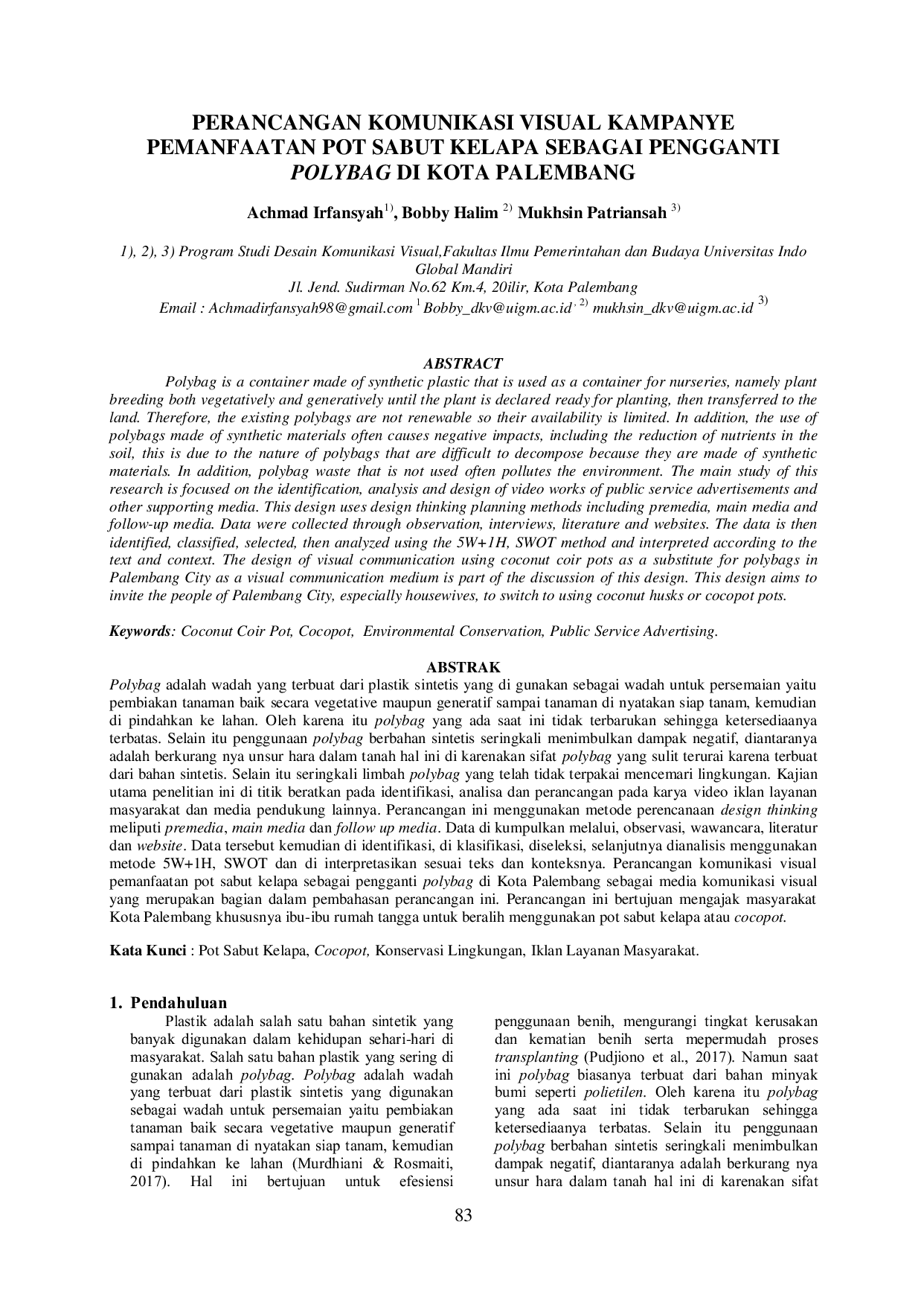 Besaung : Jurnal Seni Desain dan BudayaBesaung : Jurnal Seni Desain dan BudayaPolybag adalah wadah yang terbuat dari plastik sintetis yang digunakan sebagai wadah untuk persemaian, yaitu pembiakan tanaman baik secara vegetatif maupun generatif hingga tanaman siap ditanam di lahan. Polybag yang ada saat ini tidak terbarukan sehingga ketersediaannya terbatas. Selain itu, penggunaan polybag berbahan sintetis sering menimbulkan dampak negatif, seperti berkurangnya unsur hara dalam tanah akibat sifat polybag yang sulit terurai. Limbah polybag juga sering mencemari lingkungan. Penelitian ini berfokus pada identifikasi, analisis, dan perancangan karya video iklan layanan masyarakat serta media pendukung lainnya. Perancangan ini menggunakan metode perencanaan design thinking, meliputi premedia, main media, dan follow-up media. Data dikumpulkan melalui observasi, wawancara, literatur, dan website, kemudian diidentifikasi, diklasifikasi, dan dianalisis menggunakan metode 5W 1H dan SWOT. Perancangan komunikasi visual ini bertujuan mengajak masyarakat Kota Palembang, khususnya ibu-ibu rumah tangga, untuk beralih menggunakan pot sabut kelapa atau cocopot.