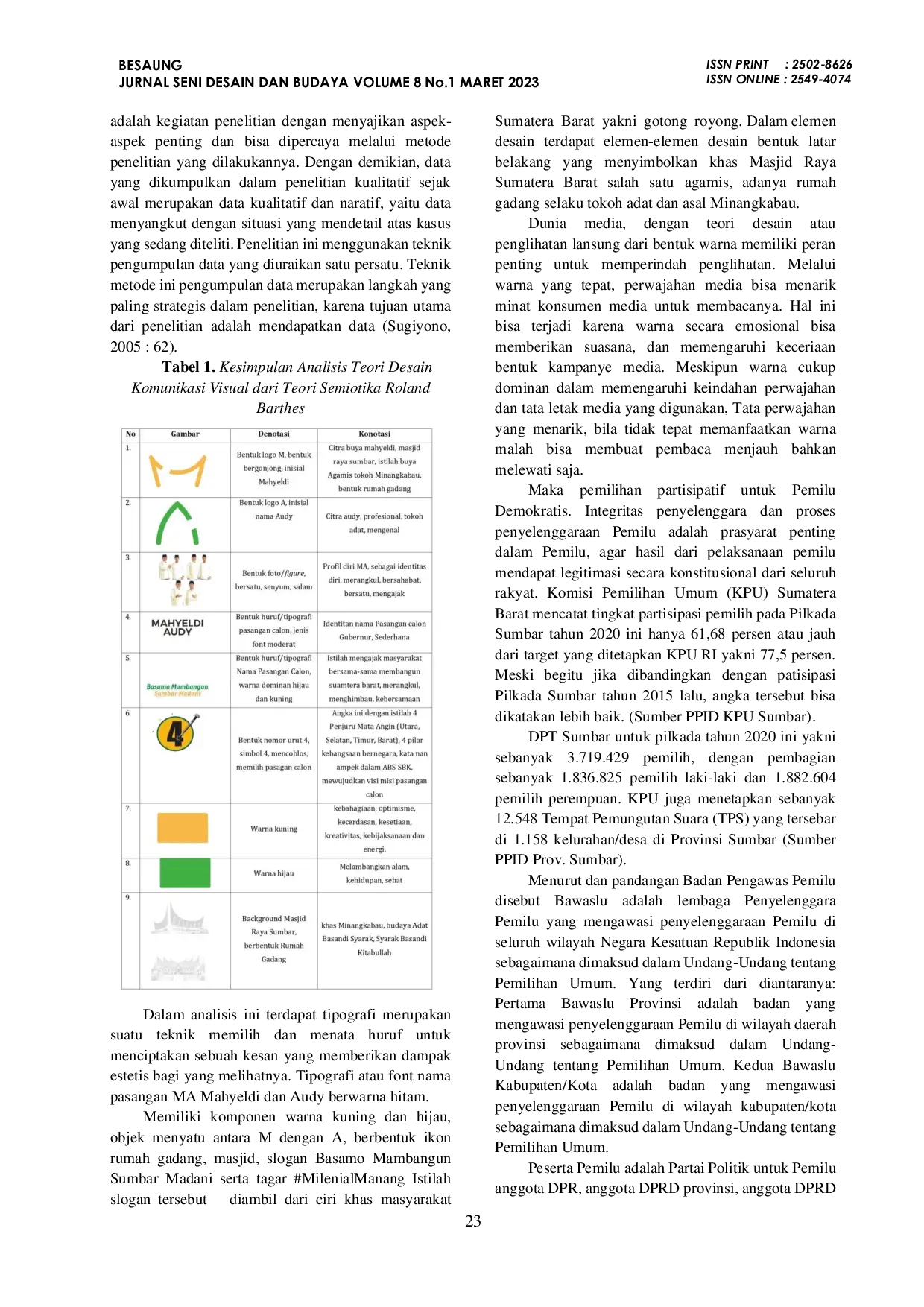 Besaung : Jurnal Seni Desain dan BudayaBesaung : Jurnal Seni Desain dan BudayaPenelitian ini tentang . Penelitian ini bertujuan untuk menganalisis media kampanye pasangan Mahyeldi dan Audy Joinaldy pada pilkada Sumatera Barat tahun 2020. Metode penelitian yang digunakan adalah penelitian kualitatif. Data dikumpulkan melalui observasi, wawancara, dokumentasi dan studi pustaka. Data dianalisis menggunakan analisis teori desain komunikasi visual, SWOT dan teori semiotika Roland Barthes. Hasil penelitian ini menunjukkan bahwa; pertama, media kampanye menjadi salah satu faktor penentu dalam upaya mendapatkan raihan suara terbanyak, terutama dalam mengkomunikasikan pesan dan tujuan personal branding kepada para pemilih. Adanya logo khusus (MA) pada media kampanye sebagai personal branding kedua pasang calon menjadi daya tarik tersendiri dalam proses kampanye yang dilakukan. Logo MA (Mahyeldi Audy) selalu muncul dalam setiap media kampanye yang dipublikasikan seperti spanduk, baliho, umbul-umbul dan media kampanye lainnya; Kedua, terdapatnya bentuk media utama dan media pendukung, saling berkaitan serta konsisten bentuk media kampanye yang digunakan. Media utama seperti logo, adanya keunikan simple, sederhana, elegant, identitas minangkabau, serta menarik perhatian sedangkan media pendukung seperti baliho, umbul-umbul, spanduk saling konsisten, keseragaman, unik dari segi figure atau foto, tagine, ikon logo, tipografi, dan warna. Makna media terdapat dari segi beberapa pandangan diantaranya komunikasi politik, antropologi politik, sosiologi politik dan lainnya.