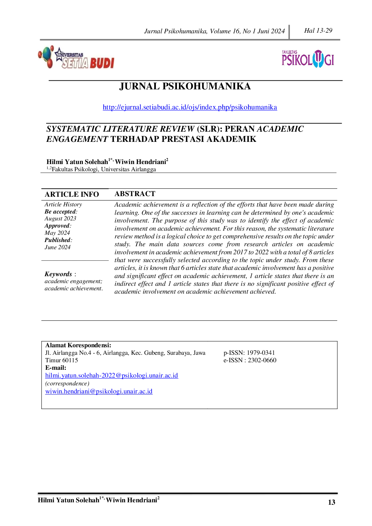 Jurnal PsikohumanikaJurnal PsikohumanikaPrestasi akademik adalah cerminan dari usaha yang telah dilakukan selama pembelajaran. Keberhasilan dalam belajar salah satunya dapat ditentukan oleh keterlibatan akademik seseorang. Tujuan penelitian ini adalah mengidentifikasi pengaruh keterlibatan akademik terhadap prestasi akademik. Untuk itu, metode systematic literature review menjadi pilihan logis untuk mendapatkan hasil yang komprehensif mengenai topik yang diteliti. Sumber data utama berasal dari artikel-artikel penelitian terhadap prestasi akademik mulai dari tahun 2017 sampai tahun 2022 dengan total sebanyak 8 artikel yang berhasil terseleksi sesuai dengan topik yang diteliti. Dari artikel-artikel tersebut, diketahui bahwa 6 artikel menyatakan keterlibatan akademik berpengaruh positif dan signifikan terhadap prestasi akademik, 1 artikel menyatakan adanya pengaruh tidak langsung dan 1 artikel menyatakan bahwa tidak adanya pengaruh positif yang signifikan keterlibatan akademik terhadap prestasi akademik yang dicapai.