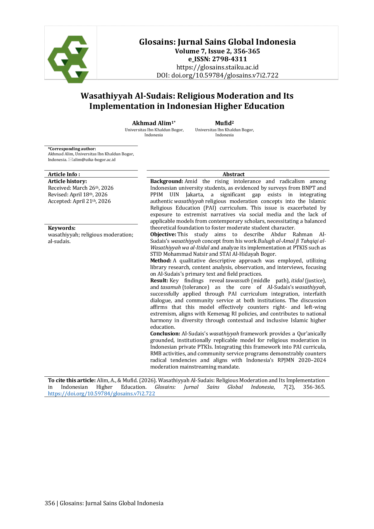 Glosains: Jurnal Sains Global IndonesiaGlosains: Jurnal Sains Global IndonesiaAmid the rising intolerance and radicalism among Indonesian university students, this study aims to describe Abdur Rahman Al-Sudaiss wasathiyyah concept from his work Bulugh al-Amal fi Tahqiqi al-Wasathiyyah wa al-Itidal and analyze its implementation at PTKIS such as STID Mohammad Natsir and STAI Al-Hidayah Bogor. A qualitative descriptive approach was employed, utilizing library research, content analysis, observation, and interviews. Key findings reveal tawassuth (middle path), itidal (justice), and tasamuh (tolerance) as the core of Al-Sudaiss wasathiyyah, successfully applied through PAI curriculum integration, interfaith dialogue, and community service. This model effectively counters right- and left-wing extremism, aligns with Kemenag RI policies, and contributes to national harmony in diversity through contextual and inclusive Islamic higher education.