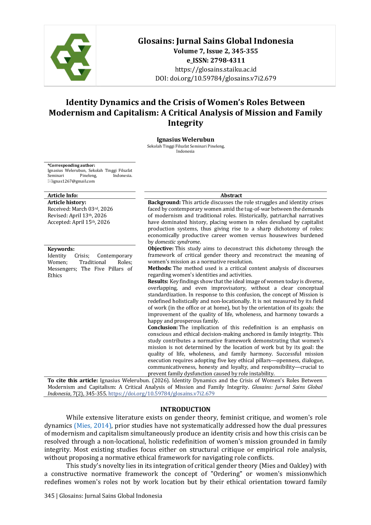 Glosains: Jurnal Sains Global IndonesiaGlosains: Jurnal Sains Global IndonesiaThis article discusses the role struggles and identity crises faced by contemporary women amid the tug-of-war between the demands of modernism and traditional roles. Historically, patriarchal narratives have dominated history, placing women in roles devalued by capitalist production systems, thus giving rise to a sharp dichotomy of roles: economically productive career women versus housewives burdened by domestic syndrome. This study aims to deconstruct this dichotomy through the framework of critical gender theory and reconstruct the meaning of womens mission as a normative resolution. The method used is a critical content analysis of discourses regarding womens identities and activities. Key findings show that the ideal image of women today is diverse, overlapping, and even improvisatory, without a clear conceptual standardization. In response to this confusion, the concept of Mission is redefined holistically and non-locationally. It is not measured by its field of work (in the office or at home), but by the orientation of its goals: the improvement of the quality of life, wholeness, and harmony towards a happy and prosperous family.