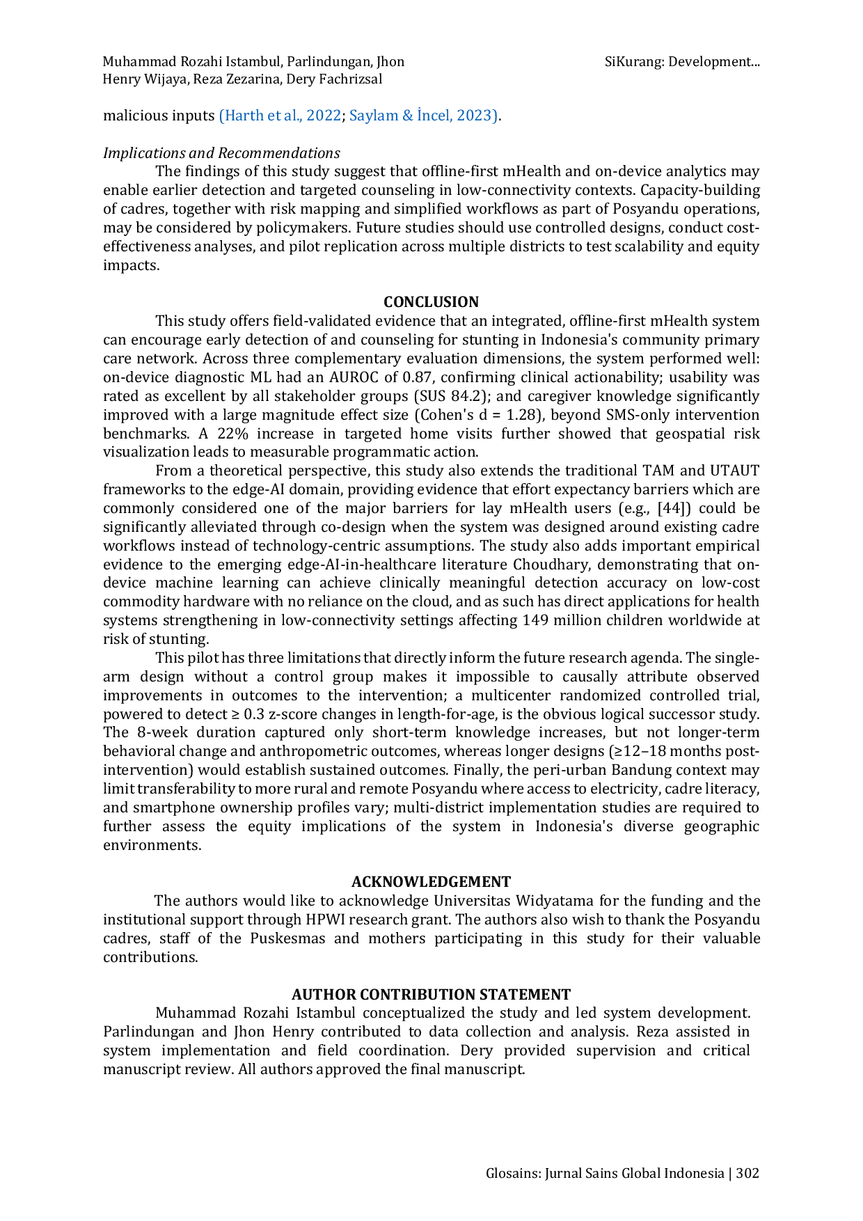 Glosains: Jurnal Sains Global IndonesiaGlosains: Jurnal Sains Global IndonesiaAplikasi Android bernama SiKurang dikembangkan untuk meningkatkan deteksi risiko stunting dan konseling di Posyandu dengan keterbatasan konektivitas. Sistem ini bekerja secara offline menggunakan pembelajaran mesin berbasis gradient boosting yang terintegrasi di perangkat, pemrosesan gambar QR untuk identifikasi anak, dialog berbahasa Indonesia berbasis NLP, serta visualisasi spasial risiko untuk perencanaan kunjungan rumah. Evaluasi pilot dengan desain campuran di dua Posyandu menunjukkan akurasi pemodelan AUROC 0,87, kepuasan pengguna (SUS 84,2), peningkatan pengetahuan caregiver (Cohens d 1,28), dan peningkatan 22 % kunjungan rumah terarah.
