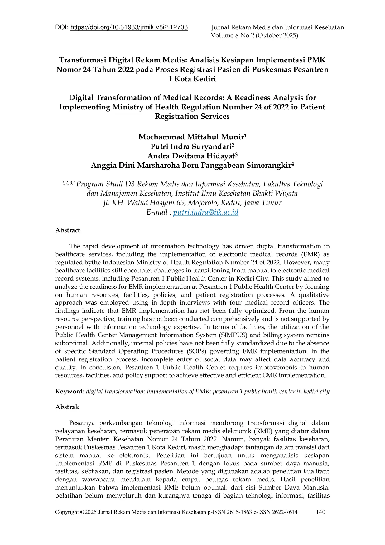 - Transformasi Digital Rekam Medis : Analisis Implementasi PMK Nomor 24 Tahun 2022 di Puskesmas Pesantren... ejournal.poltekkes-smg.ac.id/ojs/index.php/RMIK/article/view/12703Transformasi Digital Rekam Medis Analisis Implementasi PMK Nomor 24 Tahun 2022 di Puskesmas Pesantren ejournal poltekkes smg ac ojs index php RMIK article view 12703