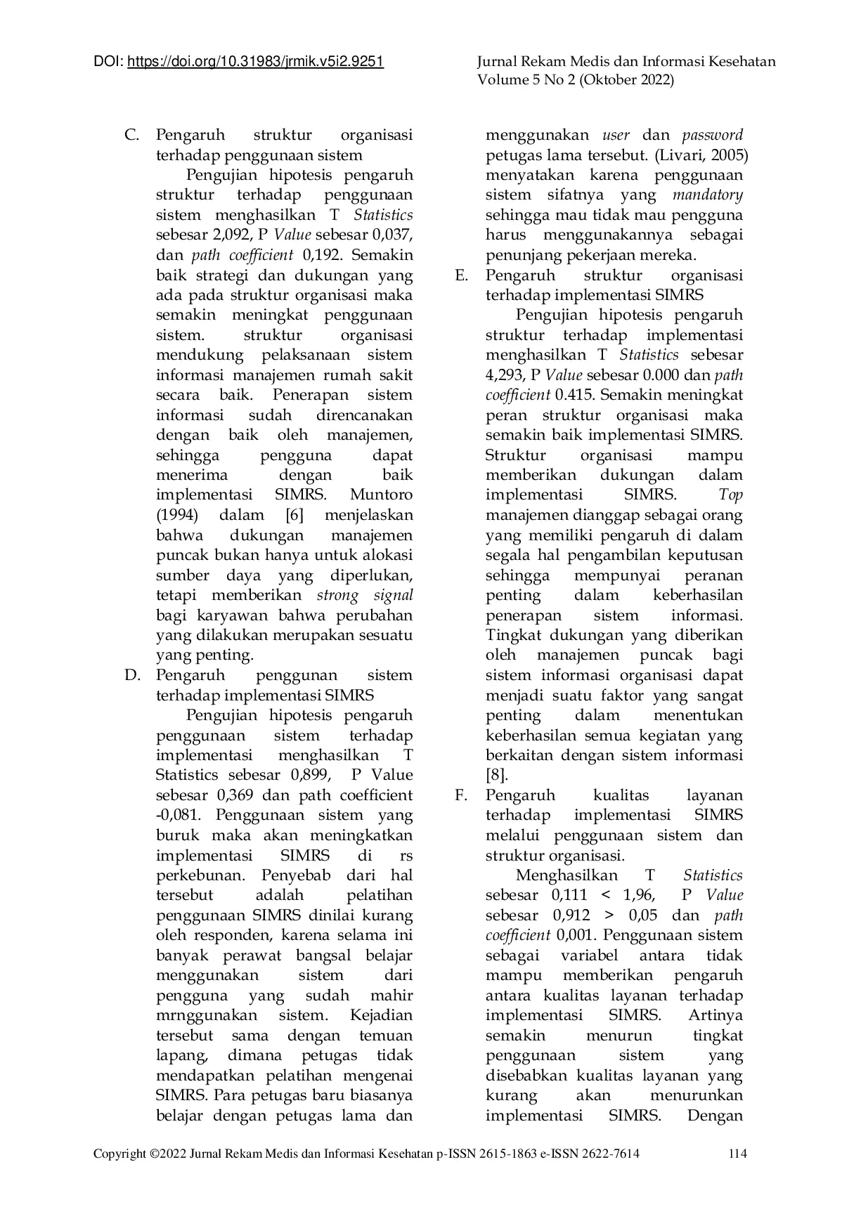 Berdasarkan pengujian dapat disimpulkan bahwa kualitas layanan tidak berpengaruh terhadap penggunaan sistem tetapi berpengaruh terhadap struktur organisasi.Struktur organisasi berpengaruh terhadap penggunaan sistem dan implementasi SIMRS.Penggunaan sistem tidak memberikan pengaruh terhadap implementasi SIMRS.Penggunaan sistem sebagai variabel intervining tidak mampu memberikan pengaruh antara kualitas layanan terhadap implementasi SIMRS dan struktur organisasi terhadap implementasi SIMRS.
