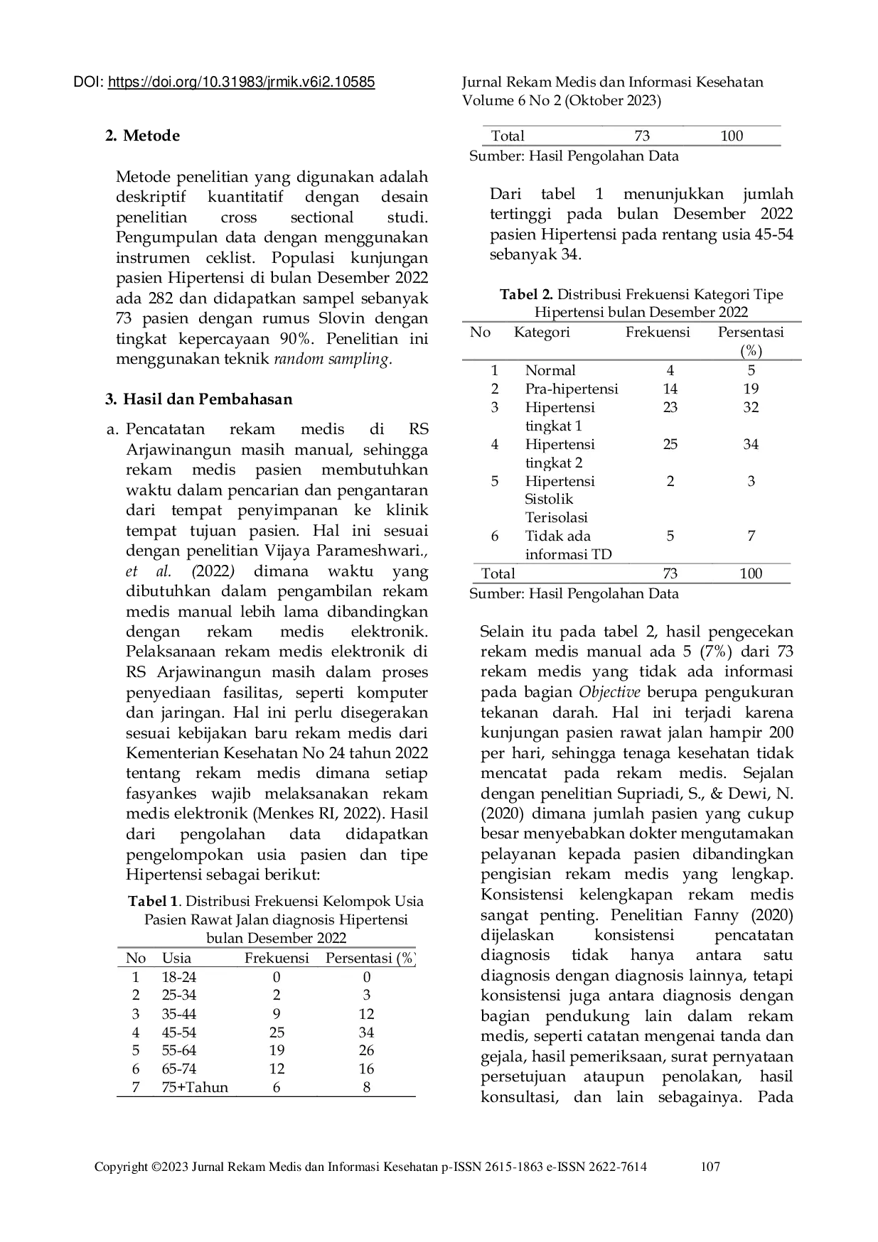 Just a moment...Just a moment...Menurunkan prevalensi hipertensi merupakan tujuan penting dalam pencegahan penyakit tidak menular. Penelitian ini bertujuan untuk mengetahui implementasi koding pasien rawat jalan di RSUD Arjawinangun. Temuan penelitian menunjukkan kebutuhan untuk meningkatkan akurasi dan kelengkapan entri rekam medis yang dilakukan oleh dokter dan tenaga kesehatan lainnya. Selain itu, perekam medis juga harus meningkatkan kemahiran mereka dalam meninjau rekam medis untuk memastikan kode diagnosis yang tepat.