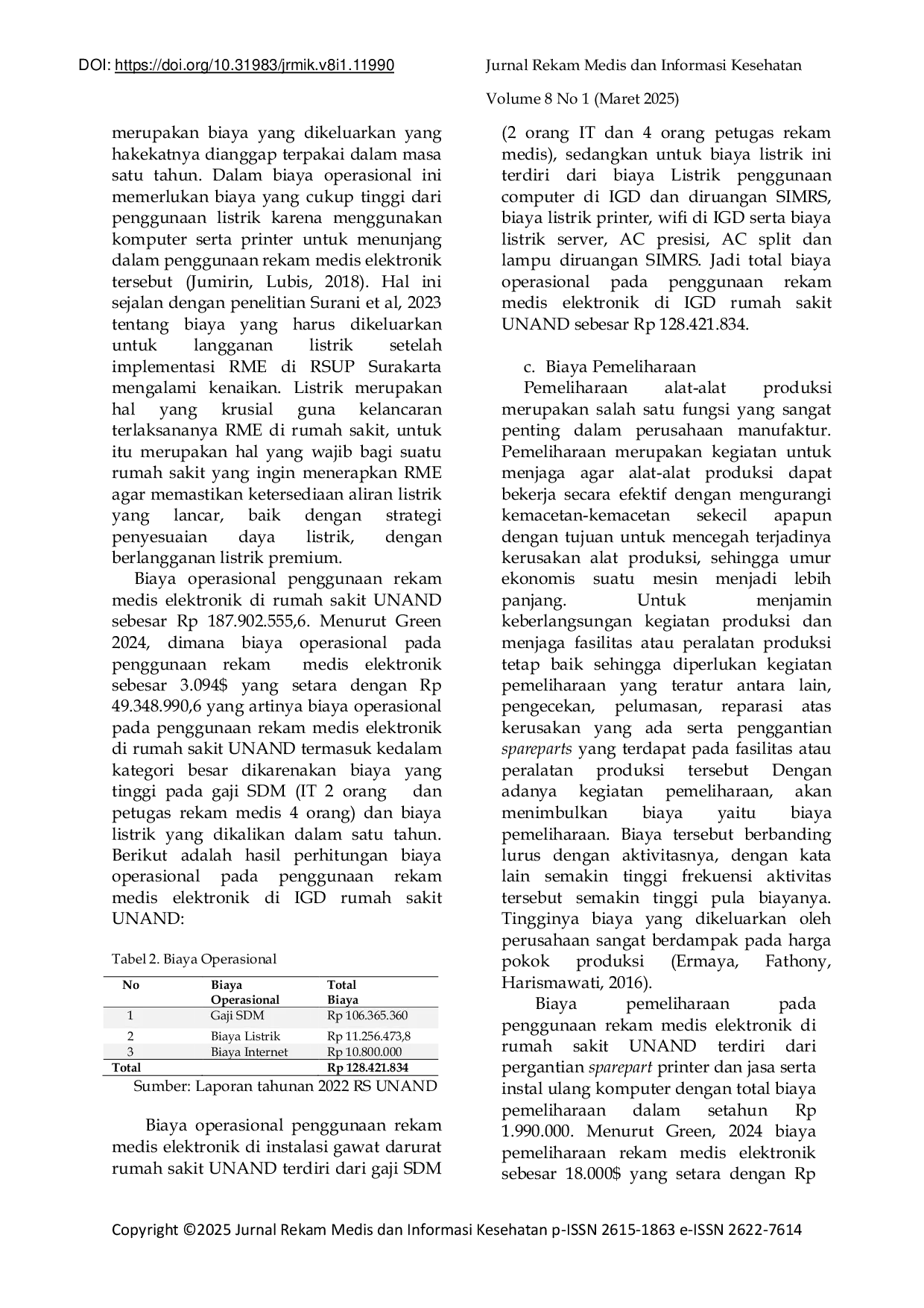 Berdasarkan hasil penelitian, total biaya investasi penggunaan RME di instalasi gawat darurat rumah sakit UNAND sebesar Rp 30.834, dan biaya pemeliharaan sebesar Rp 1.Total biaya penggunaan RME di IGD rumah sakit UNAND adalah Rp 160.Penerapan RME memiliki dampak positif dalam jangka menengah dan panjang.Penelitian lebih lanjut diperlukan untuk menganalisis manfaat penggunaan RME, apakah manfaatnya lebih tinggi dari total biaya yang dikeluarkan.