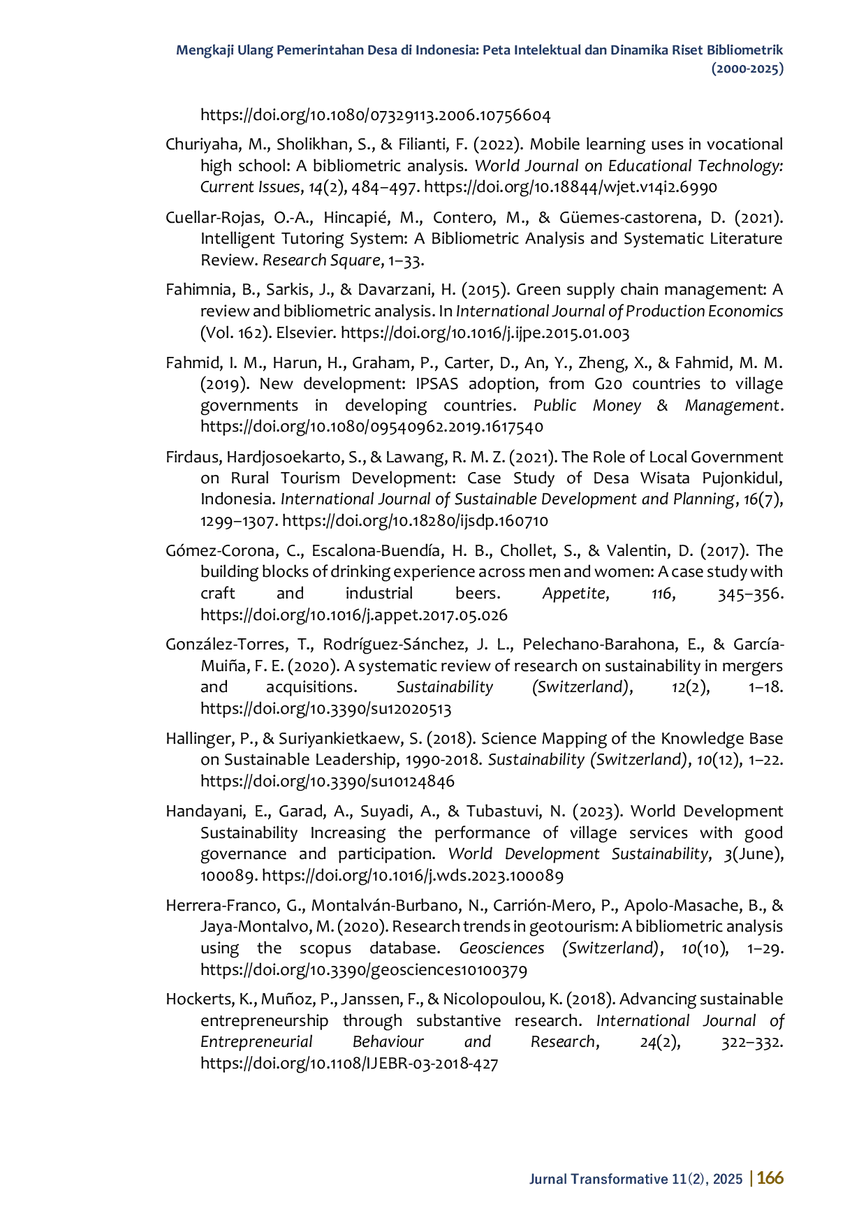 Jurnal Transformative: Ilmu PemerintahanJurnal Transformative: Ilmu PemerintahanPenelitian ini bertujuan untuk mengetahui perkembangan penelitian tentang pemerintahan desa di Indonesia dari tahun 2000 sampai dengan 2025. Penelitian ini merupakan jenis penelitian kualitatif-studi pustaka dengan spesifikasi analisis bibliometrik. Penelitian ini menggunakan mesin pencari Scopus untuk mengidentifikasi penelitian terkait pemerintahan desa di Indonesia serta VOSviewer dan NVivo versi 12 plus sebagai software untuk memetakan dan menganalisis data. Hasil penelitian menunjukkan bahwa publikasi penelitian dilakukan paling banyak di tahun 2023, dengan Indonesia sebagai negara yang paling banyak memberikan kontribusi terhadap publikasi penelitian. Sementara International Journal of Innovation Creativity and Change merupakan sumber publikasi tertinggi. Haryanto merupakan penulis yang paling banyak memberikan kontribusi terhadap publikasi ini. Lebih lanjut, topik tentang communication, community participation, indigenous people, local wisdom, hingga political will adalah topik-topik yang memiliki peluang besar untuk penelitian lebih lanjut, berkaitan dengan tema pemerintahan desa di Indonesia. Sementara itu, community (selain desa dan pemerintahan) menjadi topik yang paling sering disinggung dalam publikasi penelitian ilmiah bertema pemerintahan desa di Indonesia pada rentang waktu 2000-2025 yang terindeks Scopus. Secara konseptual, tren publikasi yang teridentifikasi menunjukkan pergeseran fokus kajian dari pendekatan normatif–institusional menuju pendekatan yang lebih kompleks dan multidimensional, yang memadukan aspek politik, sosial, ekonomi, serta budaya dalam memahami dinamika demokrasi di tingkat lokal.