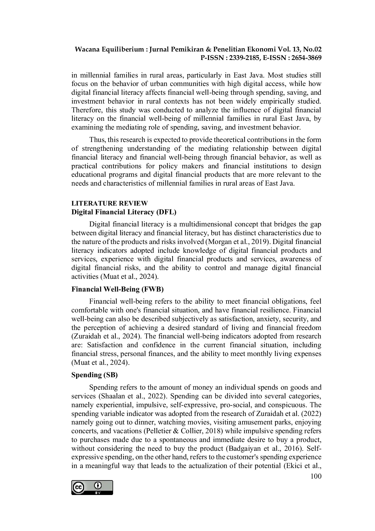 UIM | Wacana Equiliberium (Jurnal Pemikiran Penelitian Ekonomi)UIM | Wacana Equiliberium (Jurnal Pemikiran Penelitian Ekonomi)Millennial families in rural areas play an important role in driving the digital economy but still face gaps in financial literacy and access to digital financial services. This study aims to analyse the effect of Digital Financial Literacy (DFL) on Financial Well-Being (FWB) through Spending Behavior, Saving Behavior, and Investment Behavior among millennial families in rural areas of Lumajang, East Java. The research employed a quantitative survey method involving 400 respondents selected using quota sampling and analyzed with PLS-SEM. The results indicate that DFL does not directly affect FWB but has an indirect effect through the mediating variables of spending, saving, and investment behaviors. These findings highlight the importance of enhancing digital financial literacy accompanied by positive changes in financial behavior to improve the financial well-being of millennial families in rural areas.