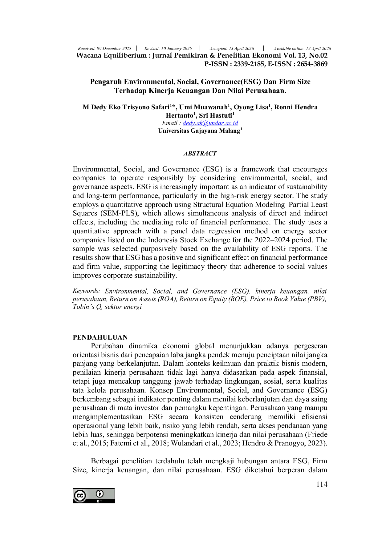 UIM | Wacana Equiliberium (Jurnal Pemikiran Penelitian Ekonomi)UIM | Wacana Equiliberium (Jurnal Pemikiran Penelitian Ekonomi)Environmental, Social, and Governance (ESG) adalah kerangka kerja yang mendorong perusahaan untuk beroperasi secara bertanggung jawab dengan mempertimbangkan aspek lingkungan, sosial, dan tata kelola. ESG semakin penting sebagai indikator keberlanjutan dan kinerja jangka panjang, terutama di sektor energi yang berisiko tinggi. Penelitian ini menggunakan pendekatan kuantitatif dengan Structural Equation Modeling–Partial Least Squares (SEM-PLS), yang memungkinkan analisis simultan efek langsung dan tidak langsung, termasuk peran mediasi kinerja keuangan. Penelitian ini menggunakan pendekatan regresi data panel kuantitatif pada perusahaan sektor energi yang terdaftar di Bursa Efek Indonesia untuk periode 2022–2024. Sampel dipilih secara purposive berdasarkan ketersediaan laporan ESG. Hasil menunjukkan bahwa ESG memiliki efek positif dan signifikan terhadap kinerja keuangan dan nilai perusahaan, mendukung teori legitimasi bahwa kepatuhan terhadap nilai sosial meningkatkan keberlanjutan perusahaan.
