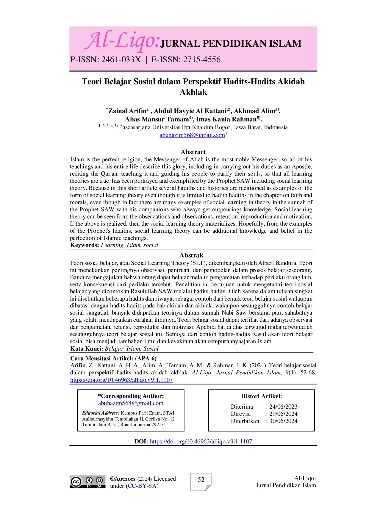 Al-Liqo: Jurnal Pendidikan IslamAl-Liqo: Jurnal Pendidikan IslamTeori sosial belajar, atau Social Learning Theory (SLT), dikembangkan oleh Albert Bandura. Teori ini menekankan pentingnya observasi, peniruan, dan pemodelan dalam proses belajar seseorang. Bandura mengajukan bahwa orang dapat belajar melalui pengamatan terhadap perilaku orang lain, serta konsekuensi dari perilaku tersebut. Penelitian ini bertujuan untuk mengetahui teori sosial belajar yang dicontohkan Rasulullah SAW melalui hadits-hadits. Oleh karena dalam tulisan singkat ini disebutkan beberapa hadits dan riwayat sebagai contoh dari bentuk teori belajar sosial walaupun dibatasi dengan hadits-hadits pada bab akidah dan akhlak, walaupun sesungguhnya contoh belajar sosial sangatlah banyak didapatkan teorinya dalam sunnah Nabi Saw bersama para sahabatnya yang selalu mendapatkan curahan ilmunya. Teori belajar sosial dapat terlihat dari adanya observasi dan pengamatan, retensi, reproduksi dan motivasi. Apabila hal di atas terwujud maka terwujudlah sesungguhnya teori belajar sosial itu. Semoga dari contoh hadits-hadits Rasul akan teori belajar sosial bisa menjadi tambahan ilmu dan keyakinan akan sempurnanya ajaran Islam.
