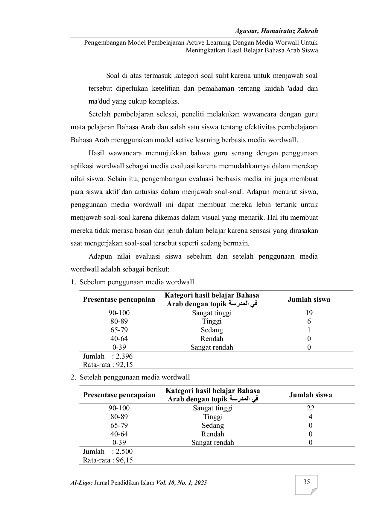 Al-Liqo: Jurnal Pendidikan IslamAl-Liqo: Jurnal Pendidikan IslamPenelitian ini bertujuan mengembangkan model pembelajaran aktif atau active learning dalam pembelajaran Bahasa Arab menggunakan media wordwall untuk meningkatkan hasil belajar siswa. Metode penelitian yang digunakan adalah Research and Development (R&D) dengan model pengembangan ADDIE yang mencakup analisis, desain, pengembangan, implementasi, dan evaluasi. Media wordwall digunakan untuk mendukung pembelajaran interaktif melalui berbagai fitur permainan yang menarik, seperti kuis dan kartu interaktif yang dirancang untuk meningkatkan motivasi dan keterlibatan siswa. Hasil penelitian menunjukkan bahwa penggunaan model active learning berbasis wordwall dapat meningkatkan pemahaman dan keaktifan siswa dalam pembelajaran Bahasa Arab, terutama pada materi ةسردملا يف. Penelitian ini memberikan kontribusi dalam pengembangan inovasi pembelajaran berbasis teknologi di dunia pendidikan.