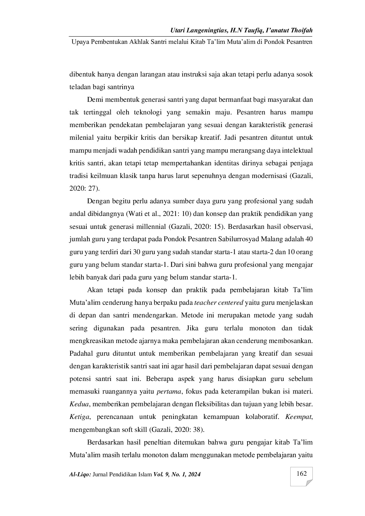 - Upaya Pembentukan Akhlak Santri melalui Kitab Ta’lim Muta’alim di Pondok Pesantren | Al-Liqo:... doi.org/10.46963/alliqo.v9i1.1161Upaya Pembentukan Akhlak Santri melalui Kitab TaAolim MutaAoalim di Pondok Pesantren Al Liqo doi 10 46963 alliqo v9i1 1161