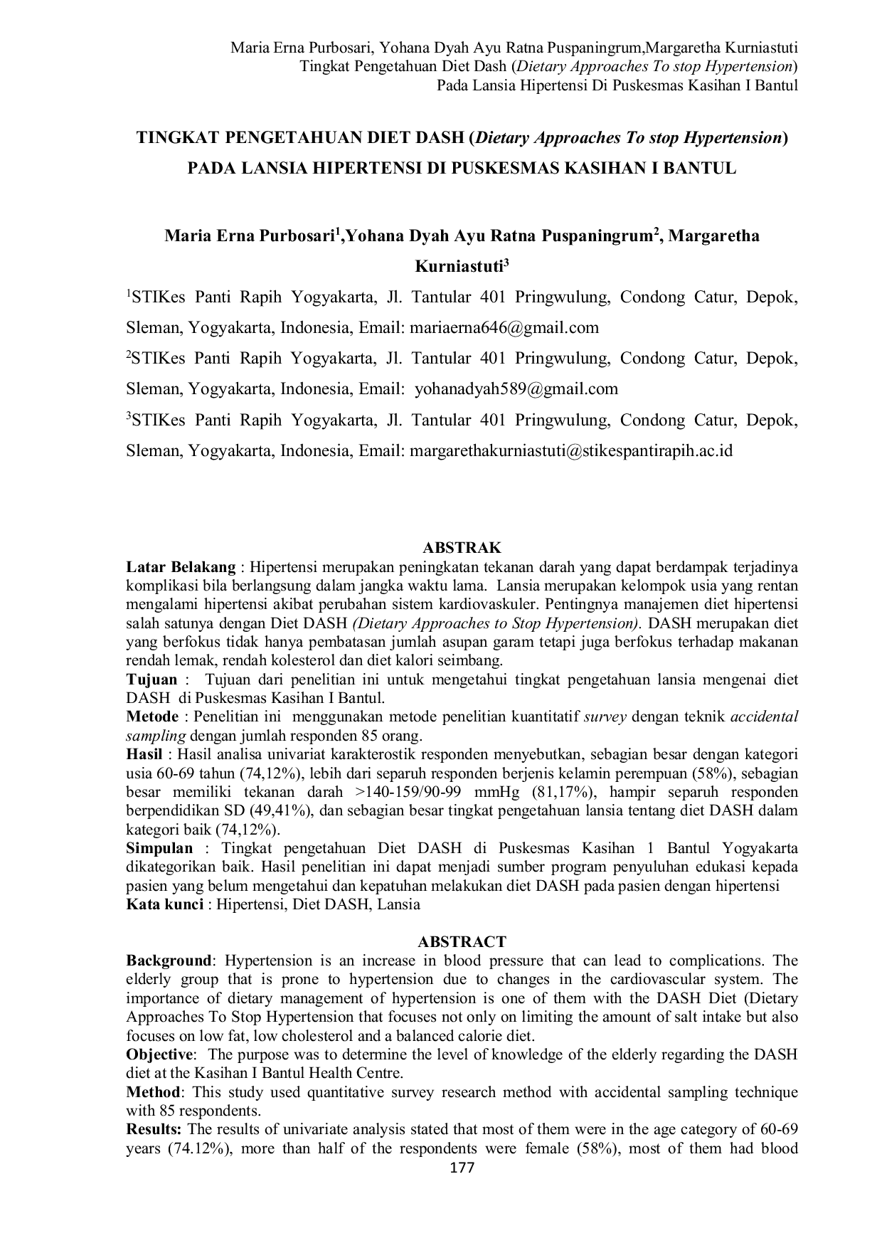 I Care Jurnal Keperawatan STIKes Panti RapihI Care Jurnal Keperawatan STIKes Panti RapihHipertensi merupakan peningkatan tekanan darah yang dapat berdampak terjadinya komplikasi bila berlangsung dalam jangka waktu lama. Lansia merupakan kelompok usia yang rentan mengalami hipertensi akibat perubahan sistem kardiovaskuler. Pentingnya manajemen diet hipertensi salah satunya dengan Diet DASH (Dietary Approaches to Stop Hypertension). DASH merupakan diet yang berfokus tidak hanya pembatasan jumlah asupan garam tetapi juga berfokus terhadap makanan rendah lemak, rendah kolesterol dan diet kalori seimbang. Tujuan dari penelitian ini untuk mengetahui tingkat pengetahuan lansia mengenai diet DASH di Puskesmas Kasihan I Bantul.